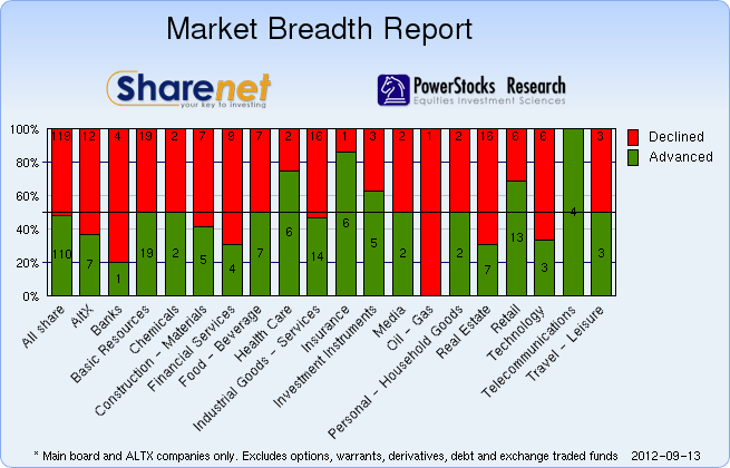 | | | Index Name | RP | Move | % Move | | Food Producers | 63,846.00 | -36.00 | -0.06% | | Personal Goods | 534.00 | 3.00 | 0.63% | | Consumer Services | 73,781.00 | 1194.00 | 1.65% | | General Retailers | 60,468.00 | 989.00 | 1.66% | | Travel & Leisure | 4,394.00 | 23.00 | 0.54% | | Media | 107.00 | 1.00 | 1.70% | | Support Services | 2,092.00 | -11.00 | -0.55% | | Telecommunications | 76,597.00 | 463.00 | 0.61% | | Financials | 26,735.00 | -111.00 | -0.42% | | Banks | 46,725.00 | -771.00 | -1.62% | | Non-life Insurance | 47,216.00 | 516.00 | 1.11% | | Life Insurance | 22,884.00 | 88.00 | 0.39% | | General Financial | 2,471.00 | -9.00 | -0.37% | | Technology | 32,674.00 | 267.00 | 0.82% | | SHARIAH TOP40 | 3,136.00 | 14 | 0.47% | | FTSE/JSE SHARIAH ALL | 3,254.00 | 14 | 0.46% | | COAL MINING | 21,249.00 | 195 | 0.93% | | FTSE JSE Fledgling | 5,566.00 | 4 | 0.08% | | FTSE/JSE Alt X | 1,034.00 | -22 | -2.17% | | SA LISTED PROPERTY | 487.00 | | -0.01% | | CAPPED PROPERTY | 392.00 | | 0.18% | | RESOURCE | 26,809.00 | 99 | 0.37% | | DIVIDEND PLUS | 198.00 | 1 | 0.67% | | FTSE/JSE RAFI 40 | 7,330.00 | 10 | 0.15% | | Capped Top 40 | 16,696.00 | 58 | 0.35% | | Capped All Share | 18,152.00 | 75 | 0.42% | | JSE TABACO | 5,456.00 | 78 | 1.45% |