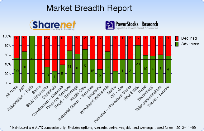 | 09/11/2012 | 169 | 183 | 63 | 415 | 193,454,546 | R11,801,309,238 | 118807 | 1561000 | | 08/11/2012 | 184 | 159 | 76 | 419 | 195,779,601 | R12,222,940,645 | 122751 | 306755 | | 07/11/2012 | 178 | 153 | 83 | 414 | 214,791,453 | R12,838,609,984 | 128228 | 1300488 | | 06/11/2012 | 197 | 141 | 72 | 410 | 214,459,062 | R10,234,583,151 | 109362 | 692117 | | 05/11/2012 | 163 | 208 | 69 | 440 | 160,571,570 | R8,970,829,325 | 106981 | 297071 |