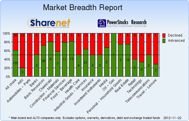 | 22/11/2012 | 226 | 120 | 67 | 413 | 276,898,318 | R14,081,937,667 | 121502 | 1495453 | | 21/11/2012 | 205 | 127 | 61 | 393 | 202,500,700 | R10,120,143,320 | 109076 | 1489515 | | 20/11/2012 | 195 | 161 | 77 | 433 | 205,594,747 | R10,361,150,260 | 120631 | 1184299 | | 19/11/2012 | 228 | 123 | 78 | 429 | 181,976,049 | R9,083,137,304 | 98327 | 849349 | | 16/11/2012 | 167 | 168 | 69 | 404 | 172,790,073 | R10,014,584,845 | 101914 | 1533424 |
