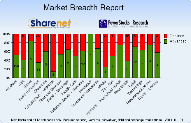 | 21/01/2014 | 180 | 176 | 58 | 414 | 206,555,807 | R13,499,245,173 | 132850 | 1553784 | | 20/01/2014 | 194 | 167 | 69 | 430 | 183,869,242 | R10,516,429,004 | 116109 | 1031703 | | 17/01/2014 | 175 | 206 | 73 | 454 | 282,477,868 | R18,536,398,376 | 181887 | 1697218 | | 16/01/2014 | 204 | 174 | 68 | 446 | 206,317,731 | R15,306,516,507 | 152287 | 1468092 | | 15/01/2014 | 235 | 125 | 67 | 427 | 189,769,052 | R11,837,322,697 | 131678 | 1400767 |