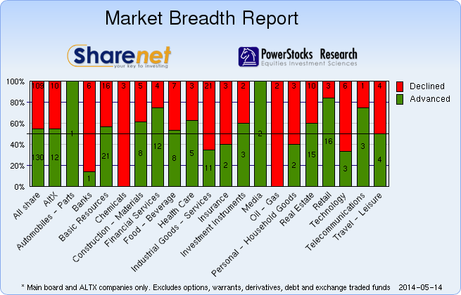 | 14/05/2014 | 215 | 151 | 63 | 429 | 263,580,412 | R22,678,897,914 | 222976 | 1240831 | | 13/05/2014 | 186 | 177 | 68 | 431 | 209,695,662 | R12,344,535,024 | 147493 | 1179556 | | 12/05/2014 | 218 | 133 | 79 | 430 | 216,387,279 | R13,566,782,370 | 157357 | 1387212 | | 09/05/2014 | 161 | 195 | 62 | 418 | 198,482,814 | R10,990,232,098 | 126255 | 1516219 | | 08/05/2014 | 211 | 155 | 58 | 424 | 239,803,911 | R18,751,698,703 | 209886 | 1883556 |