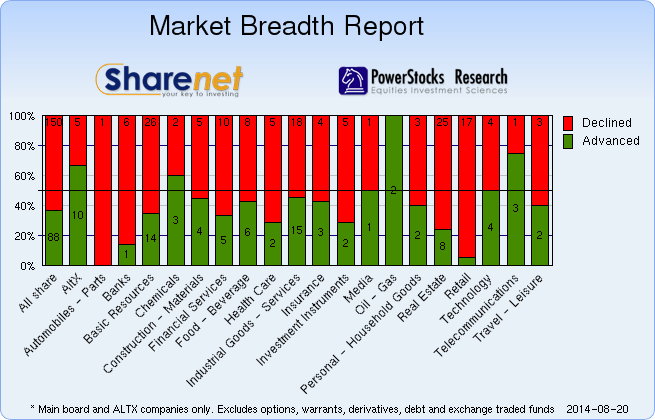 | | | Index Name | RP | Move | % Move | | Food Producers | 79,104.28 | -295.47 | -0.37% | | Personal Goods | 1,022.43 | -7.00 | -0.68% | | Consumer Services | 12,701.60 | 99.04 | 0.79% | | General Retailers | 64,045.63 | -898.54 | -1.38% | | Travel & Leisure | 5,859.31 | -64.16 | -1.08% | | Media | 303.58 | 6.71 | 2.26% | | Support Services | 2,766.33 | 6.15 | 0.22% | | Telecommunications | 11,646.55 | 32.05 | 0.28% | | Financials | 37,670.57 | -282.86 | -0.75% | | Banks | 65,301.65 | -938.87 | -1.42% | | Non-life Insurance | 56,016.14 | 829.47 | 1.50% | | Life Insurance | 35,881.40 | -186.35 | -0.52% | | General Financial | 3,620.21 | -12.62 | -0.35% | | Technology | 44,136.51 | 521.64 | 1.20% | | SHARIAH TOP40 | 4,381.14 | 30 | 0.70% | | FTSE/JSE SHARIAH ALL | 4,510.96 | 27 | 0.59% | | COAL MINING | 18,836.22 | -20 | -0.11% | | FTSE JSE Fledgling | 6,727.60 | -37 | -0.54% | | FTSE/JSE Alt X | 1,304.72 | 4 | 0.31% | | SA LISTED PROPERTY | 536.54 | | -0.78% | | CAPPED PROPERTY | 469.01 | | -0.60% | | RESOURCE | 32,024.28 | 312 | 0.98% | | DIVIDEND PLUS | 223.25 | -1 | -0.43% | | FTSE/JSE RAFI 40 | 10,139.36 | 16 | 0.16% | | Capped Top 40 | 24,549.21 | 52 | 0.21% | | Capped All Share | 26,049.50 | 34 | 0.13% | | JSE TABACO | 7,976.05 | 7 | 0.08% |