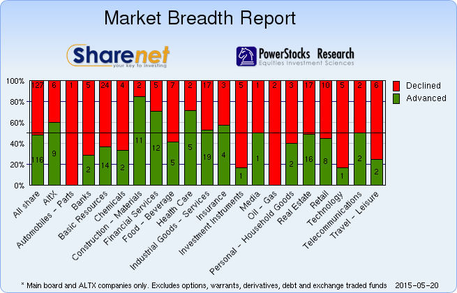 Index Summary | Index Name | RP | Move | % Move | | Top 40 | 47,995.72 | -147.37 | -0.31% | | Industrial | 77,153.30 | -212.35 | -0.27% | | Mid Cap | 75,030.64 | 148.83 | 0.20% | | Small Cap | 62,590.16 | 335.30 | 0.54% | | Resource 20 | 42,705.11 | -197.75 | -0.46% | | Industrial 25 | 68,626.10 | -249.44 | -0.36% | | Financial 15 | 17,504.94 | -30.59 | -0.17% | | Financial & Ind. 30 | 73,734.73 | -217.11 | -0.29% | | All Share | 54,212.44 | -114.69 | -0.21% | | Oil & Gas | 33,015.50 | -1693.10 | -4.88% | | Mining | 25,793.58 | -106.28 | -0.41% | | Gold Mining | 1,131.24 | -27.42 | -2.37% | | Platinum Mining | 31.37 | .25 | 0.80% | | GENERAL MINING | 7,649.69 | -18.53 | -0.24% | | Oil & Gas Producers | 17,751.83 | -910.35 | -4.88% | | Basic Materials | 24,323.90 | 7.81 | 0.03% | | Chemicals | 23,090.28 | 188.61 | 0.82% | | Forestry & Paper | 46,358.13 | 838.29 | 1.84% | | Industrial Metals | 8,752.53 | -320.60 | -3.53% | | Industrials | 46,049.82 | 109.93 | 0.24% | | General Industrials | 161.63 | -.15 | -0.09% | | Consumer Goods | 68,528.49 | -147.93 | -0.22% | | Automobiles & Parts | 8,394.35 | -6.79 | -0.08% | | Household Goods | 533.86 | 1 | 0.27% | | Health Care | 10,527.36 | 23.02 | 0.22% | | Beverages | 229.36 | -.11 | -0.05% |