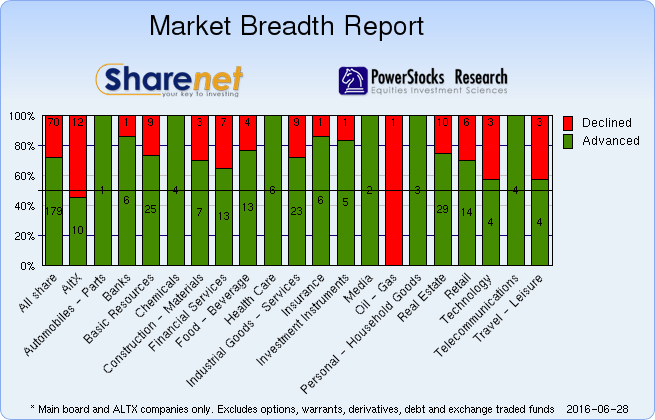 | | | Index Name | RP | Move | % Move | | Food Producers | 9,014.35 | 139.00 | 1.57% | | Personal Goods | 866.13 | 25.07 | 2.98% | | Consumer Services | 17,642.15 | 330.54 | 1.91% | | General Retailers | 7,407.96 | 210.31 | 2.92% | | Travel & Leisure | 5,852.00 | 203.52 | 3.60% | | Media | 462.66 | 5.43 | 1.19% | | Support Services | 2,184.89 | 145.88 | 7.15% | | Telecommunications | 7,666.00 | 297.30 | 4.03% | | Financials | 39,576.93 | 1078.09 | 2.80% | | Banks | 6,357.20 | 182.75 | 2.96% | | Non-life Insurance | 59,466.74 | -382.84 | -0.64% | | Life Insurance | 36,555.01 | 1123.41 | 3.17% | | General Financial | 4,107.08 | 113.57 | 2.84% | | Technology | 48,546.94 | 2302.86 | 4.98% | | SHARIAH TOP40 | 2,978.49 | 70 | 2.40% | | FTSE/JSE SHARIAH ALL | 3,294.43 | 67 | 2.07% | | COAL MINING | 8,162.78 | 375 | 4.82% | | FTSE JSE Fledgling | 7,026.97 | 25 | 0.35% | | FTSE/JSE Alt X | 1,506.83 | -14 | -0.93% | | SA LISTED PROPERTY | 628.87 | 16.05 | 2.62% | | CAPPED PROPERTY | 532.06 | | 2.72% | | RESOURCE | 16,650.05 | 228 | 1.39% | | DIVIDEND PLUS | 195.05 | 6 | 3.06% | | FTSE/JSE RAFI 40 | 9,146.45 | 217 | 2.43% | | Capped Top 40 | 23,990.01 | 558 | 2.38% | | Capped All Share | 26,066.18 | 559 | 2.19% | | JSE TABACO | 11,800.71 | 144 | 1.23% |