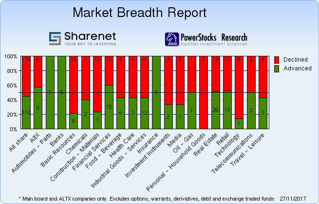 | | | Index Name | RP | Move | % Move | | Food Producers | 9,482.75 | -54.05 | -0.57% | | Personal Goods | 1,210.00 | -23.47 | -1.90% | | Consumer Services | 26,570.04 | 177.84 | 0.67% | | General Retailers | 6,834.96 | 44.55 | 0.66% | | Travel & Leisure | 4,373.63 | 3.28 | 0.08% | | Media | 824.84 | 7.13 | 0.87% | | Support Services | 2,077.45 | -65.29 | -3.05% | | Telecommunications | 6,837.03 | 12.80 | 0.19% | | Financials | 43,317.70 | 347.37 | 0.81% | | Banks | 8,218.87 | 144.26 | 1.79% | | Non-life Insurance | 67,649.25 | 166.52 | 0.25% | | Life Insurance | 40,321.81 | 213.79 | 0.53% | | General Financial | 3,763.64 | 7.99 | 0.21% | | Technology | 42,499.99 | -208.53 | -0.49% | | SHARIAH TOP40 | 3,218.28 | -50 | -1.54% | | FTSE/JSE SHARIAH ALL | 3,623.51 | -45 | -1.22% | | COAL MINING | 20,037.19 | 694 | 3.59% | | FTSE JSE Fledgling | 7,523.72 | -32 | -0.43% | | FTSE/JSE TOP 40 USD | 4,204.12 | 707 | 20.21% | | FTSE/JSE Alt X | 1,174.09 | 5 | 0.40% | | SA LISTED PROPERTY | 661.20 | 2.55 | 0.39% | | CAPPED PROPERTY | 528.51 | | 0.21% | | RESOURCE | 21,272.83 | -415 | -1.91% | | DIVIDEND PLUS | 234.12 | 2 | 0.74% | | FTSE/JSE RAFI 40 | 10,996.41 | -62 | -0.56% | | Capped Top 40 | 27,449.44 | -145 | -0.53% | | Capped All Share | 29,829.22 | -119 | -0.40% | | JSE TABACO | 11,734.01 | -150 | -1.26% |
