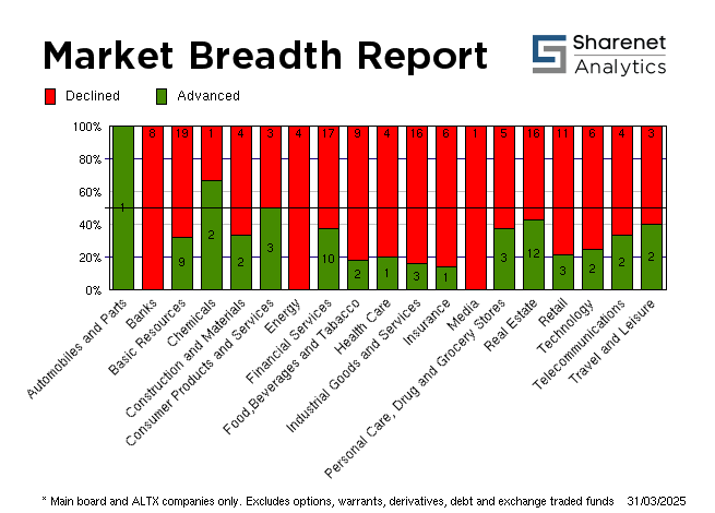 | Index Name | RP | Move | % Move | | Top 40 | 81,410.32 | -786.50 | -0.96% | | Industrial | 130,987.01 | -1503.21 | -1.13% | | Mid Cap | 88,934.12 | -925.12 | -1.03% | | Small Cap | 86,387.20 | -827.80 | -0.95% | | Resource 20 | 68,652.79 | -399.24 | -0.58% | | Industrial 25 | 123,082.85 | -1392.18 | -1.12% | | Financial 15 | 20,249.25 | -204.95 | -1.00% | | Financial 30 | 122,778.04 | -1329.10 | -1.07% | | All Share | 88,637.45 | -935.13 | -1.04% | | FTSE/JSE Energy | 21,005.03 | -853.34 | -3.90% | | FTSE/JSE Basic Materials | 49,038.47 | -375.91 | -0.76% | | FTSE/JSE Chemicals | 5,452.07 | 25.75 | 0.47% | | FTSE/JSE Industrials | 36,299.14 | -911.10 | -2.45% | | FTSE/JSE Consumer Staples | 90,931.85 | 288.86 | 0.32% | | FTSE/JSE Health Care | 4,878.11 | -63.25 | -1.28% | | FTSE/JSE Beverages | 220.19 | -2.36 | -1.06% | | FTSE/JSE Food Producers | 7,707.72 | 8.29 | 0.11% | | FTSE/JSE Personal Goods | 3,229.77 | -116.08 | -3.47% | | FTSE/JSE Travel & Leisure | 3,290.99 | -1.48 | -0.04% | | FTSE/JSE Media | 825.99 | .00 | 0.00% | | FTSE/JSE Real Estate | 1,310.46 | -2.07 | -0.16% | | FTSE/JSE SA Financials | 49,561.46 | -525.02 | -1.05% | | FTSE/JSE Financials | 51,393.44 | -621.06 | -1.19% | | FTSE/JSE Banks | 12,381.82 | -135.82 | -1.09% | | FTSE/JSE Life Insurance | 43,817.92 | -759.58 | -1.70% |