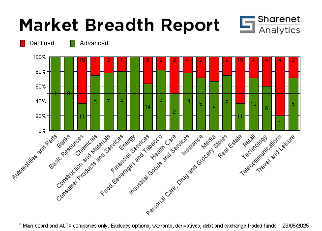 | Index Name | RP | Move | % Move | | Top 40 | 86,121.53 | 187.01 | 0.22% | | Industrial | 140,932.19 | 583.93 | 0.42% | | Mid Cap | 94,479.44 | 191.94 | 0.20% | | Small Cap | 89,984.93 | 146.05 | 0.16% | | Resource 20 | 72,803.45 | -977.90 | -1.33% | | Industrial 25 | 132,698.24 | 471.65 | 0.36% | | Financial 15 | 20,830.78 | 240.51 | 1.17% | | Financial 30 | 129,777.25 | 894.61 | 0.69% | | All Share | 93,724.31 | 195.57 | 0.21% | | FTSE/JSE Energy | 20,314.65 | 514.94 | 2.60% | | FTSE/JSE Basic Materials | 52,007.30 | -696.50 | -1.32% | | FTSE/JSE Chemicals | 5,938.62 | 218.41 | 3.82% | | FTSE/JSE Industrials | 37,435.91 | 575.51 | 1.56% | | FTSE/JSE Consumer Staples | 97,597.81 | 468.01 | 0.48% | | FTSE/JSE Health Care | 4,187.02 | -23.31 | -0.55% | | FTSE/JSE Beverages | 243.35 | 3.33 | 1.39% | | FTSE/JSE Food Producers | 8,551.30 | 105.06 | 1.24% | | FTSE/JSE Personal Goods | 3,509.97 | 41.28 | 1.19% | | FTSE/JSE Travel & Leisure | 3,411.21 | 36.42 | 1.08% | | FTSE/JSE Media | 825.99 | .00 | 0.00% | | FTSE/JSE Real Estate | 1,367.33 | -3.40 | -0.25% | | FTSE/JSE SA Financials | 51,189.13 | 477.62 | 0.94% | | FTSE/JSE Financials | 52,991.59 | 599.23 | 1.14% | | FTSE/JSE Banks | 12,622.56 | 171.17 | 1.37% | | FTSE/JSE Life Insurance | 45,908.76 | 507.64 | 1.12% |