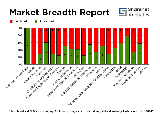 | Index Name | RP | Move | % Move | | Top 40 | 103,114.20 | -227.67 | -0.22% | | Industrial | 153,862.10 | 188.91 | 0.12% | | Mid Cap | 105,684.61 | -506.84 | -0.48% | | Small Cap | 101,887.50 | -562.52 | -0.55% | | Resource 20 | 108,090.16 | -642.97 | -0.59% | | Industrial 25 | 145,246.00 | 229.17 | 0.16% | | Financial 15 | 23,083.03 | -83.25 | -0.36% | | Financial 30 | 143,711.29 | -67.10 | -0.05% | | All Share | 110,443.73 | -298.96 | -0.27% | | FTSE/JSE Energy | 22,144.75 | -450.94 | -2.00% | | FTSE/JSE Basic Materials | 75,422.66 | -485.17 | -0.64% | | FTSE/JSE Chemicals | 7,342.97 | 7.96 | 0.11% | | FTSE/JSE Industrials | 33,652.39 | -84.53 | -0.25% | | FTSE/JSE Consumer Staples | 98,164.97 | -206.22 | -0.21% | | FTSE/JSE Health Care | 3,950.41 | -18.04 | -0.45% | | FTSE/JSE Beverages | 205.76 | -1.14 | -0.55% | | FTSE/JSE Food Producers | 9,095.29 | -57.20 | -0.62% | | FTSE/JSE Personal Goods | 3,520.68 | -63.33 | -1.77% | | FTSE/JSE Travel & Leisure | 3,150.91 | -2.66 | -0.08% | | FTSE/JSE Media | 825.99 | .00 | 0.00% | | FTSE/JSE Real Estate | 1,545.66 | -13.06 | -0.84% | | FTSE/JSE SA Financials | 56,840.07 | -223.18 | -0.39% | | FTSE/JSE Financials | 58,659.57 | -185.61 | -0.32% | | FTSE/JSE Banks | 14,084.66 | -50.48 | -0.36% | | FTSE/JSE Life Insurance | 49,517.60 | -164.84 | -0.33% |