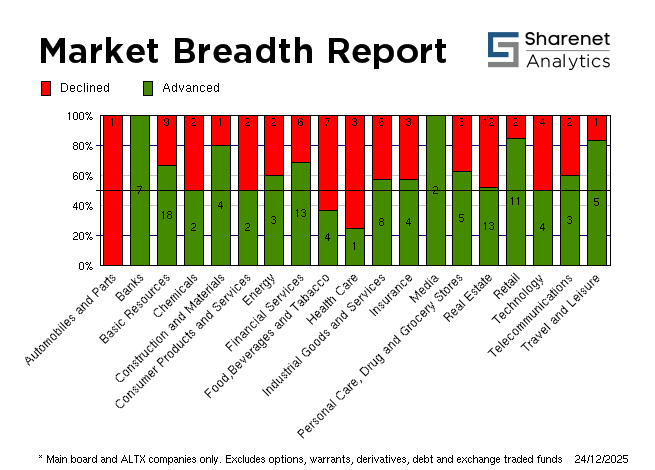 | 24/12/2025 | 187 | 101 | 35 | 323 | 56,679,493 | R4,808,686,140 | 93411 | 750504 | | 23/12/2025 | 293 | 115 | 45 | 453 | 158,666,825 | R13,952,814,447 | 240364 | 3392859 | | 22/12/2025 | 226 | 145 | 31 | 402 | 226,900,300 | R16,136,569,627 | 276825 | 4006616 | | 19/12/2025 | 187 | 143 | 35 | 365 | 646,835,556 | R72,205,249,033 | 389197 | 5596770 | | 18/12/2025 | 248 | 98 | 35 | 381 | 500,355,603 | R70,866,652,528 | 348889 | 4865605 | * Includes all listed instruments on the JSE