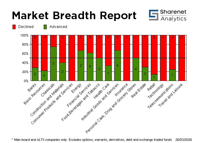 | 26/03/2026 | 141 | 230 | 36 | 407 | 253,318,890 | R24,980,347,120 | 378076 | 5659554 | | 25/03/2026 | 278 | 108 | 30 | 416 | 314,082,554 | R31,328,651,509 | 553223 | 6267442 | | 24/03/2026 | 258 | 169 | 32 | 459 | 314,918,951 | R29,423,508,383 | 460621 | 6703046 | | 23/03/2026 | 173 | 228 | 33 | 434 | 457,203,354 | R40,591,593,752 | 594695 | 6540917 | | 20/03/2026 | 178 | 188 | 34 | 400 | 791,153,881 | R74,348,052,051 | 602450 | 6872766 | * Includes all listed instruments on the JSE