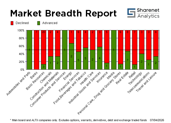 | 07/04/2026 | 149 | 289 | 38 | 476 | 253,307,289 | R22,689,668,730 | 375149 | 6541230 | | 02/04/2026 | 179 | 201 | 29 | 409 | 212,936,406 | R24,964,634,545 | 366605 | 6793710 | | 01/04/2026 | 310 | 94 | 25 | 429 | 329,906,340 | R36,197,908,700 | 544791 | 5634944 | | 31/03/2026 | 242 | 137 | 29 | 408 | 328,461,971 | R31,922,712,733 | 431962 | 5152479 | | 30/03/2026 | 226 | 215 | 30 | 471 | 322,434,032 | R28,226,294,017 | 416543 | 5764047 | * Includes all listed instruments on the JSE