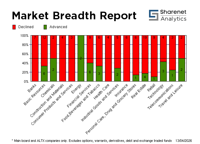 | 14/04/2026 | 340 | 97 | 18 | 455 | 256,277,390 | R23,213,564,966 | 349778 | 2328587 | | 13/04/2026 | 212 | 217 | 22 | 451 | 227,899,016 | R18,613,998,317 | 275035 | 5266377 | | 10/04/2026 | 276 | 82 | 23 | 381 | 183,720,396 | R17,205,856,328 | 252916 | 6472277 | | 09/04/2026 | 139 | 240 | 25 | 404 | 243,416,312 | R25,353,211,876 | 354912 | 5682539 | | 08/04/2026 | 326 | 99 | 13 | 438 | 457,835,309 | R45,218,043,362 | 660911 | 7607830 | * Includes all listed instruments on the JSE
