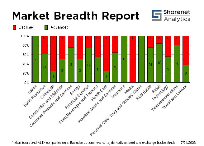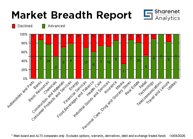 | 16/04/2026 | 223 | 166 | 32 | 421 | 215,704,495 | R21,581,191,749 | 306822 | 0 | | 15/04/2026 | 229 | 145 | 29 | 403 | 258,479,450 | R24,693,782,837 | 387510 | 0 | | 14/04/2026 | 340 | 97 | 18 | 455 | 256,277,390 | R23,213,564,966 | 349778 | 0 | | 13/04/2026 | 212 | 217 | 22 | 451 | 227,899,016 | R18,613,998,317 | 275035 | 0 | | 10/04/2026 | 276 | 82 | 23 | 381 | 183,720,396 | R17,205,856,328 | 252916 | 0 | * Includes all listed instruments on the JSE
