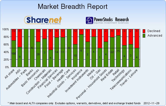 Local markets By noon on Thursday the JSE All Share was 1.01% up, with gold shares charging upwards by 5.12% and resources 2.28% higher. Investors were optimistic following hopeful statements regarding a fiscal cliff solution in the US.  Full story