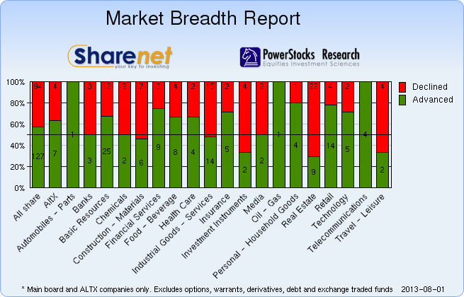 | 01/08/2013 | 221 | 127 | 68 | 416 | 195,439,548 | R13,194,122,158 | 149340 | 378823 | | 31/07/2013 | 209 | 131 | 81 | 421 | 198,404,937 | R13,629,317,823 | 153588 | 398350 | | 30/07/2013 | 184 | 155 | 72 | 411 | 207,239,143 | R11,878,040,092 | 128374 | 940092 | | 29/07/2013 | 207 | 157 | 66 | 430 | 146,262,317 | R9,787,081,794 | 120604 | 1349989 | | 26/07/2013 | 117 | 207 | 72 | 396 | 183,098,444 | R12,912,558,904 | 141632 | 1789261 |