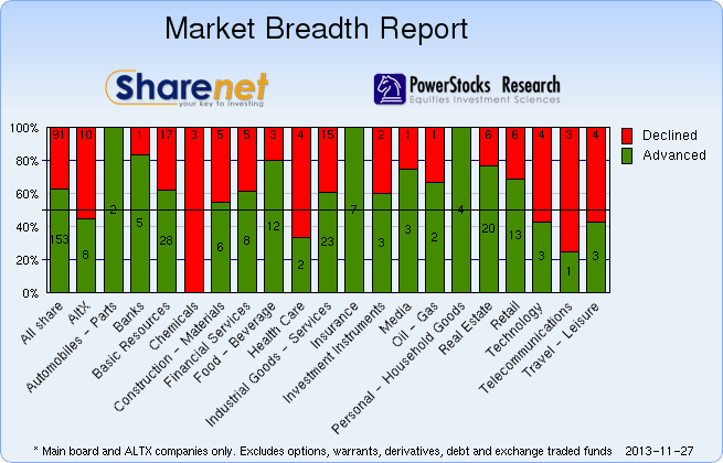 | | | Index Name | RP | Move | % Move | | Food Producers | 69,140.41 | 339.51 | 0.49% | | Personal Goods | 1,041.01 | 25.67 | 2.53% | | Consumer Services | 10,294.68 | 167.56 | 1.65% | | General Retailers | 62,111.48 | 111.14 | 0.18% | | Travel & Leisure | 5,612.13 | 26.32 | 0.47% | | Media | 208.24 | 4.54 | 2.23% | | Support Services | 2,538.72 | -32.25 | -1.25% | | Telecommunications | 9,385.57 | 53.45 | 0.57% | | Financials | 32,528.75 | 433.06 | 1.35% | | Banks | 54,684.43 | 1070.81 | 2.00% | | Non-life Insurance | 48,492.19 | 382.83 | 0.80% | | Life Insurance | 31,431.97 | 257.57 | 0.83% | | General Financial | 3,163.22 | 32.85 | 1.05% | | Technology | 44,540.53 | -156.33 | -0.35% | | SHARIAH TOP40 | 3,694.53 | 37 | 1.01% | | FTSE/JSE SHARIAH ALL | 3,830.67 | 32 | 0.85% | | COAL MINING | 17,683.91 | 78 | 0.44% | | FTSE JSE Fledgling | 6,201.40 | -3 | -0.05% | | FTSE/JSE Alt X | 1,116.03 | 18 | 1.61% | | SA LISTED PROPERTY | 506.10 | | 1.62% | | CAPPED PROPERTY | 428.89 | | 1.33% | | RESOURCE | 26,935.30 | 278 | 1.04% | | DIVIDEND PLUS | 212.62 | 1 | 0.30% | | FTSE/JSE RAFI 40 | 8,750.39 | 104 | 1.20% | | Capped Top 40 | 21,014.54 | 298 | 1.44% | | Capped All Share | 22,565.87 | 290 | 1.30% | | JSE TABACO | 6,990.98 | 117 | 1.70% |