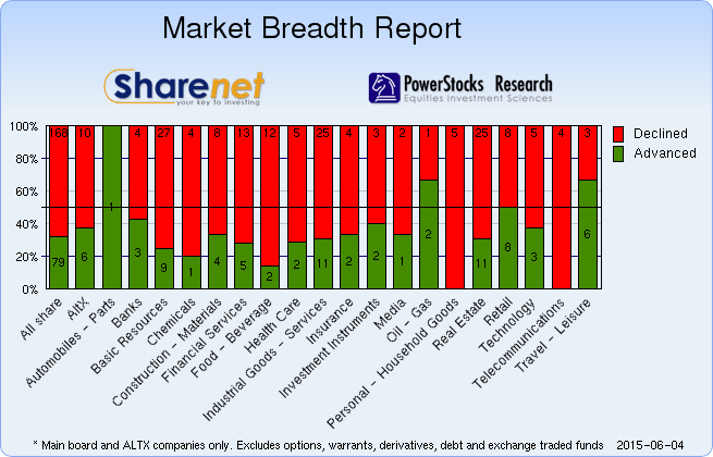 | | | Index Name | RP | Move | % Move | | Food Producers | 8,363.19 | -40.44 | -0.48% | | Personal Goods | 1,055.09 | -5.30 | -0.50% | | Consumer Services | 15,812.07 | -109.02 | -0.68% | | General Retailers | 80,175.53 | 454.83 | 0.57% | | Travel & Leisure | 6,093.55 | -88.51 | -1.43% | | Media | 387.27 | -4.87 | -1.24% | | Support Services | 3,205.81 | 21.74 | 0.68% | | Telecommunications | 10,377.68 | -226.08 | -2.13% | | Financials | 43,041.37 | -116.05 | -0.27% | | Banks | 75,904.66 | -380.93 | -0.50% | | Non-life Insurance | 53,514.97 | -571.69 | -1.06% | | Life Insurance | 40,690.36 | -18.04 | -0.04% | | General Financial | 4,377.11 | -7.61 | -0.17% | | Technology | 61,401.05 | 885.39 | 1.46% | | SHARIAH TOP40 | 3,534.48 | -70 | -1.96% | | FTSE/JSE SHARIAH ALL | 3,764.43 | -69 | -1.81% | | COAL MINING | 10,463.58 | 8 | 0.07% | | FTSE JSE Fledgling | 6,898.26 | -20 | -0.29% | | FTSE/JSE Alt X | 1,336.58 | -5 | -0.35% | | SA LISTED PROPERTY | 601.97 | | -0.45% | | CAPPED PROPERTY | 527.30 | | -0.20% | | RESOURCE | 22,511.28 | -711 | -3.06% | | DIVIDEND PLUS | 221.64 | -2 | -1.12% | | FTSE/JSE RAFI 40 | 9,587.12 | -152 | -1.56% | | Capped Top 40 | 24,322.13 | -269 | -1.09% | | Capped All Share | 26,032.30 | -267 | -1.02% | | JSE TABACO | 8,506.86 | -41 | -0.48% |