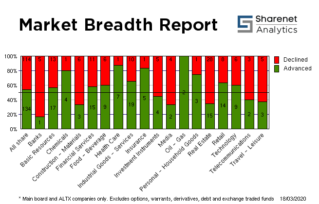 | | | Index Name | RP | Move | % Move | | Food Producers | 8,033.10 | -55.77 | -0.69% | | Personal Goods | 1,046.20 | 27.46 | 2.70% | | Consumer Services | 16,713.89 | -20.65 | -0.12% | | General Retailers | 7,478.43 | -57.72 | -0.77% | | Travel & Leisure | 5,243.56 | 68.68 | 1.33% | | Media | 427.58 | -.12 | -0.03% | | Support Services | 1,915.21 | -80.86 | -4.05% | | Telecommunications | 7,807.85 | .71 | 0.01% | | Financials | 41,385.76 | -478.46 | -1.14% | | Banks | 6,540.52 | -175.14 | -2.61% | | Non-life Insurance | 55,883.43 | -1100.00 | -1.93% | | Life Insurance | 39,328.20 | 57.70 | 0.15% | | General Financial | 4,524.08 | -26.46 | -0.58% | | Technology | 54,628.15 | -122.67 | -0.22% | | SHARIAH TOP40 | 3,079.31 | -67 | -2.14% | | FTSE/JSE SHARIAH ALL | 3,380.82 | -63 | -1.84% | | COAL MINING | 10,239.82 | -695 | -6.36% | | FTSE JSE Fledgling | 6,755.62 | -9 | -0.13% | | FTSE/JSE Alt X | 1,503.12 | -1 | -0.06% | | SA LISTED PROPERTY | 626.99 | | -0.87% | | CAPPED PROPERTY | 553.30 | | -0.90% | | RESOURCE | 17,248.33 | -625 | -3.50% | | DIVIDEND PLUS | 205.68 | -2 | -1.04% | | FTSE/JSE RAFI 40 | 9,398.32 | -148 | -1.55% | | Capped Top 40 | 24,693.82 | -243 | -0.98% | | Capped All Share | 26,695.21 | -234 | -0.87% | | JSE TABACO | 11,112.60 | -63 | -0.56% |