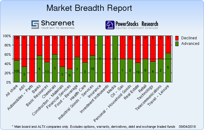 | | | Index Name | RP | Move | % Move | | Food Producers | 9,845.42 | -39.21 | -0.40% | | Personal Goods | 1,100.74 | 22.87 | 2.12% | | Consumer Services | 23,402.99 | 178.06 | 0.77% | | General Retailers | 8,440.21 | -49.57 | -0.58% | | Travel & Leisure | 4,953.14 | 44.29 | 0.90% | | Media | 654.54 | 4.96 | 0.76% | | Support Services | 2,046.96 | -10.75 | -0.52% | | Telecommunications | 6,558.12 | 1.02 | 0.02% | | Financials | 45,363.91 | 114.57 | 0.25% | | Banks | 9,773.19 | 15.24 | 0.16% | | Non-life Insurance | 85,636.02 | 1591.19 | 1.89% | | Life Insurance | 43,583.53 | 180.60 | 0.42% | | General Financial | 3,747.03 | 9.11 | 0.24% | | Technology | 27,428.93 | 769.05 | 2.88% | | SHARIAH TOP40 | 2,853.15 | 4 | 0.15% | | FTSE/JSE SHARIAH ALL | 3,275.63 | -3 | -0.09% | | COAL MINING | 14,770.83 | -568 | -3.70% | | FTSE JSE Fledgling | 7,541.44 | 27 | 0.35% | | FTSE/JSE TOP 40 USD | 4,391.45 | 894 | 25.57% | | FTSE/JSE Alt X | 1,097.87 | -4 | -0.37% | | SA LISTED PROPERTY | 571.47 | 2.06 | 0.36% | | CAPPED PROPERTY | 462.08 | | 0.49% | | RESOURCE | 19,635.19 | -35 | -0.18% | | DIVIDEND PLUS | 246.46 | -1 | -0.40% | | FTSE/JSE RAFI 40 | 10,716.32 | 14 | 0.13% | | Capped Top 40 | 25,851.06 | 121 | 0.47% | | Capped All Share | 28,298.42 | 95 | 0.34% | | JSE TABACO | 9,340.90 | -26 | -0.27% | | ALL SHARE NET TRI | 56,091.56 | 213 | 0.38% |