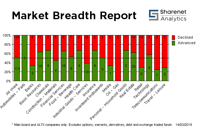 | 14/03/2019 | 185 | 148 | 36 | 369 | 294,255,370 | R22,082,405,538 | 323993 | 2786300 | | 13/03/2019 | 191 | 153 | 53 | 397 | 284,139,502 | R19,693,516,342 | 319806 | 2609044 | | 12/03/2019 | 228 | 158 | 59 | 445 | 286,593,753 | R17,238,882,663 | 270059 | 2546742 | | 11/03/2019 | 145 | 206 | 35 | 386 | 210,608,439 | R14,888,913,274 | 254659 | 2280887 | | 08/03/2019 | 169 | 170 | 52 | 391 | 249,294,776 | R17,431,398,045 | 288695 | 2280077 |