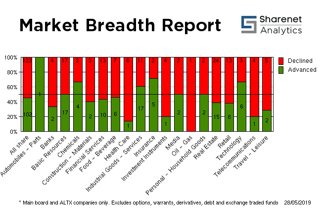 | | | Index Name | RP | Move | % Move | | Food Producers | 7,048.65 | 70.07 | 1.00% | | Personal Goods | 1,036.32 | -10.28 | -0.98% | | Consumer Services | 22,428.23 | 143.24 | 0.64% | | General Retailers | 6,242.64 | 85.97 | 1.40% | | Travel & Leisure | 4,176.20 | 22.47 | 0.54% | | Media | 783.61 | 4.76 | 0.61% | | Support Services | 1,658.90 | 21.06 | 1.29% | | Telecommunications | 5,072.83 | -11.64 | -0.23% | | Financials | 42,214.23 | 545.77 | 1.31% | | Banks | 9,456.24 | 121.45 | 1.30% | | Non-life Insurance | 80,880.96 | 264.32 | 0.33% | | Life Insurance | 42,167.58 | 990.95 | 2.41% | | General Financial | 3,438.81 | 64.15 | 1.90% | | Technology | 31,166.10 | 649.21 | 2.13% | | SHARIAH TOP40 | 3,347.72 | 59 | 1.79% | | FTSE/JSE SHARIAH ALL | 3,765.02 | 64 | 1.72% | | COAL MINING | 24,560.00 | 752 | 3.16% | | FTSE JSE Fledgling | 6,220.45 | 14 | 0.23% | | LARGE CAP | 57,897.46 | 765 | 1.34% | | FTSE/JSE TOP 40 USD | 3,921.26 | 424 | 12.12% | | FTSE/JSE Alt X | 905.14 | 8 | 0.92% | | SA LISTED PROPERTY | 483.11 | -.38 | -0.08% | | CAPPED PROPERTY | 383.43 | | 0.24% | | RESOURCE | 27,471.26 | 542 | 2.01% | | DIVIDEND PLUS | 255.93 | 3 | 1.21% | | FTSE/JSE RAFI 40 | 11,245.54 | 157 | 1.41% | | Capped Top 40 | 26,392.05 | 320 | 1.23% | | Capped All Share | 28,749.23 | 357 | 1.26% | | JSE TABACO | 7,372.02 | -147 | -1.95% | | JSE ALL PROPERTY | 12,421.55 | 30.46 | 0.25% | | ALL SHARE NET TRI | 57,926.01 | 768 | 1.34% |