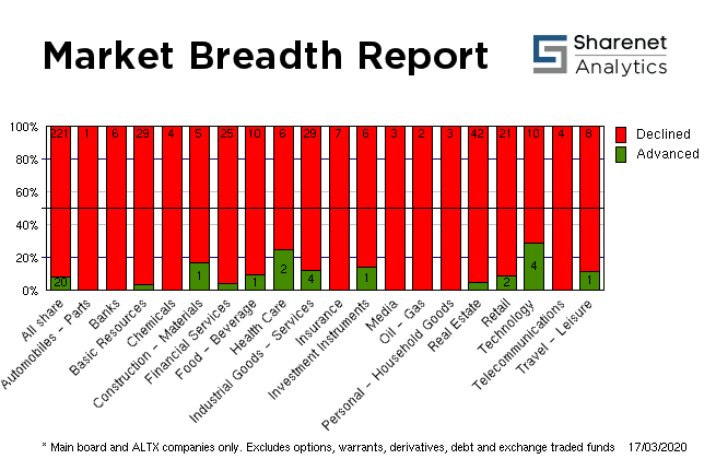 | | | Index Name | RP | Move | % Move | | Food Producers | 6,691.80 | -157.31 | -2.30% | | Personal Goods | 1,162.16 | -2.10 | -0.18% | | Consumer Services | 21,972.05 | -347.90 | -1.56% | | General Retailers | 5,947.13 | -123.53 | -2.03% | | Travel & Leisure | 3,729.61 | -12.00 | -0.32% | | Media | 821.29 | 9.84 | 1.21% | | Support Services | 1,480.82 | -13.44 | -0.90% | | Telecommunications | 5,687.84 | -119.85 | -2.06% | | Financials | 40,549.87 | -1007.10 | -2.42% | | Banks | 9,252.70 | -326.50 | -3.41% | | Non-life Insurance | 79,902.98 | -1229.08 | -1.51% | | Life Insurance | 40,582.31 | -841.47 | -2.03% | | General Financial | 3,201.06 | -49.73 | -1.53% | | Technology | 32,578.75 | -933.14 | -2.78% | | SHARIAH TOP40 | 3,094.25 | -35 | -1.12% | | FTSE/JSE SHARIAH ALL | 3,543.34 | -34 | -0.96% | | COAL MINING | 18,229.65 | -426 | -2.28% | | FTSE JSE Fledgling | 5,899.87 | -8 | -0.14% | | LARGE CAP | 57,012.53 | -1020 | -1.76% | | FTSE/JSE TOP 40 USD | 3,714.47 | 217 | 6.21% | | FTSE/JSE Alt X | 790.32 | -5 | -0.66% | | SA LISTED PROPERTY | 469.05 | -6.55 | -1.38% | | CAPPED PROPERTY | 355.21 | | -1.45% | | RESOURCE | 25,210.21 | -150 | -0.59% | | DIVIDEND PLUS | 243.72 | -6 | -2.27% | | FTSE/JSE RAFI 40 | 10,768.35 | -172 | -1.57% | | Capped Top 40 | 25,742.18 | -435 | -1.66% | | Capped All Share | 28,029.88 | -431 | -1.52% | | JSE TABACO | 6,883.13 | 94 | 1.38% | | JSE ALL PROPERTY | 11,650.89 | -165.15 | -1.40% | | ALL SHARE NET TRI | 56,895.23 | -959 | -1.66% |