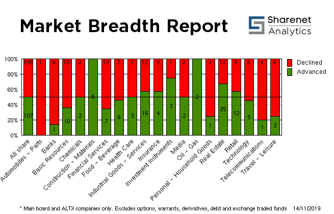 | | | Index Name | RP | Move | % Move | | Food Producers | 6,843.04 | -11.98 | -0.17% | | Personal Goods | 1,089.15 | -.90 | -0.08% | | Consumer Services | 22,503.78 | -41.05 | -0.18% | | General Retailers | 5,709.73 | 44.89 | 0.79% | | Travel & Leisure | 3,344.06 | -50.42 | -1.49% | | Media | 814.97 | -3.26 | -0.40% | | Support Services | 1,614.06 | 12.70 | 0.79% | | Telecommunications | 5,517.83 | -114.43 | -2.03% | | Financials | 40,540.93 | 15.08 | 0.04% | | Banks | 9,208.50 | -7.00 | -0.08% | | Non-life Insurance | 77,421.05 | 975.33 | 1.28% | | Life Insurance | 41,582.83 | -52.36 | -0.13% | | General Financial | 3,164.99 | -7.60 | -0.24% | | Technology | 28,085.33 | 175.95 | 0.63% | | SHARIAH TOP40 | 3,222.27 | -20 | -0.63% | | FTSE/JSE SHARIAH ALL | 3,662.92 | -20 | -0.55% | | COAL MINING | 18,907.83 | -309 | -1.61% | | FTSE JSE Fledgling | 5,840.72 | 39 | 0.66% | | LARGE CAP | 55,528.68 | -151 | -0.27% | | FTSE/JSE TOP 40 USD | 3,630.25 | 133 | 3.80% | | FTSE/JSE Alt X | 861.32 | -2 | -0.19% | | SA LISTED PROPERTY | 458.26 | 2.37 | 0.52% | | CAPPED PROPERTY | 352.76 | | 0.65% | | RESOURCE | 26,644.61 | -163 | -0.61% | | DIVIDEND PLUS | 241.20 | -1 | -0.59% | | FTSE/JSE RAFI 40 | 10,807.20 | -40 | -0.37% | | Capped Top 40 | 25,656.07 | -74 | -0.29% | | Capped All Share | 27,913.97 | -65 | -0.23% | | JSE TABACO | 7,071.10 | -95 | -1.33% | | JSE ALL PROPERTY | 11,571.88 | 69.84 | 0.61% | | ALL SHARE NET TRI | 56,235.94 | -102 | -0.18% |