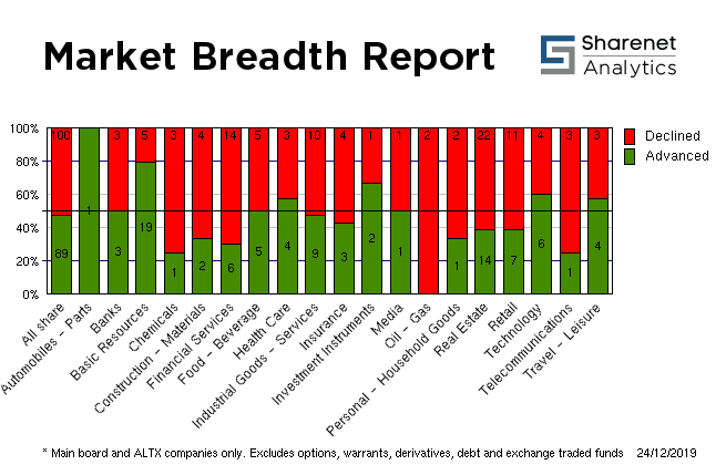 | | | Index Name | RP | Move | % Move | | Food Producers | 6,836.54 | 16.89 | 0.25% | | Personal Goods | 1,111.32 | -1.40 | -0.13% | | Consumer Services | 21,974.03 | -89.39 | -0.41% | | General Retailers | 5,633.57 | -33.24 | -0.59% | | Travel & Leisure | 3,434.75 | -16.80 | -0.49% | | Media | 755.31 | -7.50 | -0.98% | | Support Services | 1,615.65 | -.20 | -0.01% | | Telecommunications | 4,692.06 | -44.55 | -0.94% | | Financials | 39,429.28 | -118.65 | -0.30% | | Banks | 8,771.00 | -23.97 | -0.27% | | Non-life Insurance | 77,709.15 | 1559.47 | 2.05% | | Life Insurance | 40,681.89 | -134.75 | -0.33% | | General Financial | 3,232.56 | -14.18 | -0.44% | | Technology | 30,537.83 | 27.32 | 0.09% | | SHARIAH TOP40 | 3,314.42 | 34 | 1.05% | | FTSE/JSE SHARIAH ALL | 3,762.81 | 36 | 0.96% | | COAL MINING | 19,068.96 | 319 | 1.70% | | FTSE JSE Fledgling | 5,774.99 | 17 | 0.30% | | LARGE CAP | 56,391.68 | 104 | 0.18% | | FTSE/JSE TOP 40 USD | 3,883.70 | 386 | 11.05% | | FTSE/JSE Alt X | 880.76 | -2 | -0.24% | | SA LISTED PROPERTY | 442.20 | -1.03 | -0.23% | | CAPPED PROPERTY | 339.48 | | -0.37% | | RESOURCE | 28,149.09 | 349 | 1.25% | | DIVIDEND PLUS | 238.99 | 0 | 0.03% | | FTSE/JSE RAFI 40 | 10,800.07 | 33 | 0.31% | | Capped Top 40 | 25,995.52 | 82 | 0.32% | | Capped All Share | 28,302.05 | 77 | 0.27% | | JSE TABACO | 7,596.67 | 29 | 0.38% | | JSE ALL PROPERTY | 11,174.24 | -31.53 | -0.28% | | ALL SHARE NET TRI | 57,244.87 | 152 | 0.27% |