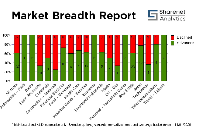 | | | Index Name | RP | Move | % Move | | Food Producers | 6,865.64 | 41.31 | 0.61% | | Personal Goods | 1,130.50 | 8.19 | 0.73% | | Consumer Services | 22,019.46 | 436.50 | 2.02% | | General Retailers | 5,719.02 | 174.77 | 3.15% | | Travel & Leisure | 3,406.31 | 61.23 | 1.83% | | Media | 748.14 | 5.87 | 0.79% | | Support Services | 1,578.49 | 9.34 | 0.60% | | Telecommunications | 4,666.60 | 26.88 | 0.58% | | Financials | 39,047.73 | 545.15 | 1.42% | | Banks | 8,565.98 | 165.64 | 1.97% | | Non-life Insurance | 77,360.26 | 829.96 | 1.08% | | Life Insurance | 40,335.58 | 865.64 | 2.19% | | General Financial | 3,234.25 | 16.90 | 0.53% | | Technology | 32,020.24 | 411.72 | 1.30% | | SHARIAH TOP40 | 3,344.26 | -10 | -0.30% | | FTSE/JSE SHARIAH ALL | 3,794.58 | -9 | -0.23% | | COAL MINING | 19,874.59 | 364 | 1.86% | | FTSE JSE Fledgling | 5,637.35 | -41 | -0.73% | | LARGE CAP | 57,206.00 | 438 | 0.77% | | FTSE/JSE TOP 40 USD | 3,863.67 | 366 | 10.48% | | FTSE/JSE Alt X | 874.71 | -2 | -0.18% | | SA LISTED PROPERTY | 444.04 | 2.68 | 0.61% | | CAPPED PROPERTY | 339.76 | | 0.61% | | RESOURCE | 28,412.78 | -162 | -0.57% | | DIVIDEND PLUS | 240.87 | 3 | 1.20% | | FTSE/JSE RAFI 40 | 10,837.98 | 60 | 0.56% | | Capped Top 40 | 26,284.55 | 175 | 0.67% | | Capped All Share | 28,626.00 | 185 | 0.65% | | JSE TABACO | 8,331.41 | 11 | 0.14% | | JSE ALL PROPERTY | 11,214.58 | 70.77 | 0.64% | | ALL SHARE NET TRI | 57,967.13 | 394 | 0.69% |