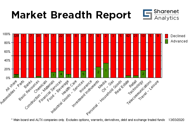 | | | Index Name | RP | Move | % Move | | Food Producers | 5,603.31 | -99.15 | -1.74% | | Personal Goods | 1,040.71 | 2.00 | 0.19% | | Consumer Services | 18,333.44 | -542.49 | -2.87% | | General Retailers | 4,603.35 | -218.72 | -4.54% | | Travel & Leisure | 2,539.95 | -70.26 | -2.69% | | Media | 589.52 | -3.78 | -0.64% | | Support Services | 1,453.31 | -48.95 | -3.26% | | Telecommunications | 4,165.61 | -256.46 | -5.80% | | Financials | 33,745.93 | -1178.50 | -3.37% | | Banks | 7,646.10 | -207.14 | -2.64% | | Non-life Insurance | 66,079.21 | -2524.23 | -3.68% | | Life Insurance | 32,654.31 | -1301.57 | -3.83% | | General Financial | 2,824.83 | -135.99 | -4.59% | | Technology | 31,127.31 | -1757.43 | -5.34% | | SHARIAH TOP40 | 2,842.54 | -188 | -6.21% | | FTSE/JSE SHARIAH ALL | 3,224.99 | -200 | -5.83% | | COAL MINING | 16,556.00 | 420 | 2.60% | | FTSE JSE Fledgling | 4,998.24 | -106 | -2.07% | | LARGE CAP | 50,893.22 | -2272 | -4.27% | | FTSE/JSE TOP 40 USD | 3,133.06 | -364 | -10.41% | | FTSE/JSE Alt X | 848.97 | -19 | -2.16% | | SA LISTED PROPERTY | 363.42 | -13.20 | -3.50% | | CAPPED PROPERTY | 275.85 | | -3.22% | | RESOURCE | 24,164.60 | -1692 | -6.54% | | DIVIDEND PLUS | 202.67 | -8 | -3.62% | | FTSE/JSE RAFI 40 | 9,408.69 | -458 | -4.64% | | Capped Top 40 | 23,147.56 | -1085 | -4.48% | | Capped All Share | 25,098.74 | -1171 | -4.46% | | JSE TABACO | 7,767.77 | -337 | -4.16% | | JSE ALL PROPERTY | 9,174.64 | -316.80 | -3.34% | | ALL SHARE NET TRI | 51,038.18 | -2407 | -4.50% |