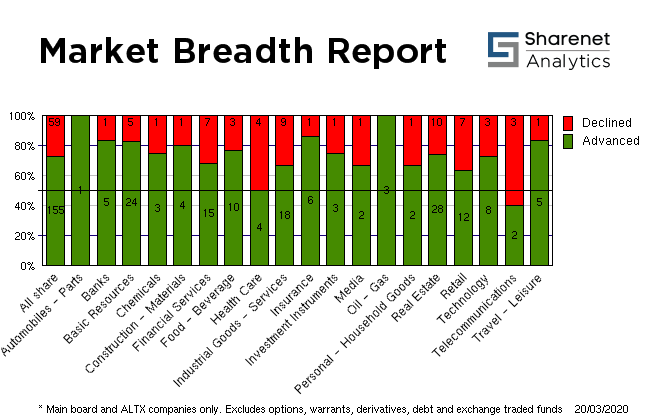 | | | Index Name | RP | Move | % Move | | Food Producers | 5,807.54 | 139.51 | 2.46% | | Personal Goods | 970.60 | 81.80 | 9.20% | | Consumer Services | 15,525.73 | 436.93 | 2.90% | | General Retailers | 3,232.39 | 123.94 | 3.99% | | Travel & Leisure | 1,327.95 | 52.14 | 4.09% | | Media | 618.40 | 39.64 | 6.85% | | Support Services | 1,289.12 | 116.59 | 9.94% | | Telecommunications | 2,844.64 | -109.47 | -3.71% | | Financials | 23,227.16 | 1436.19 | 6.59% | | Banks | 5,018.43 | 356.56 | 7.65% | | Non-life Insurance | 64,715.34 | 243.17 | 0.38% | | Life Insurance | 24,768.11 | 838.58 | 3.50% | | General Financial | 1,999.21 | 104.51 | 5.52% | | Technology | 28,446.51 | 1489.10 | 5.52% | | SHARIAH TOP40 | 2,087.34 | 144 | 7.39% | | FTSE/JSE SHARIAH ALL | 2,406.68 | 164 | 7.29% | | COAL MINING | 11,973.53 | 148 | 1.25% | | FTSE JSE Fledgling | 4,360.28 | 103 | 2.42% | | LARGE CAP | 40,452.40 | 2389 | 6.28% | | FTSE/JSE TOP 40 USD | 2,227.71 | -1270 | -36.30% | | FTSE/JSE Alt X | 811.10 | 7 | 0.93% | | SA LISTED PROPERTY | 235.19 | 20.80 | 9.70% | | CAPPED PROPERTY | 172.68 | | 8.15% | | RESOURCE | 17,309.33 | 1249 | 7.78% | | DIVIDEND PLUS | 156.21 | 4 | 2.72% | | FTSE/JSE RAFI 40 | 6,981.18 | 318 | 4.76% | | Capped Top 40 | 18,059.88 | 1029 | 6.04% | | Capped All Share | 19,676.99 | 1135 | 6.12% | | JSE TABACO | 6,817.19 | 108 | 1.61% | | JSE ALL PROPERTY | 5,885.68 | 482.98 | 8.94% | | ALL SHARE NET TRI | 40,272.00 | 2309 | 6.08% |