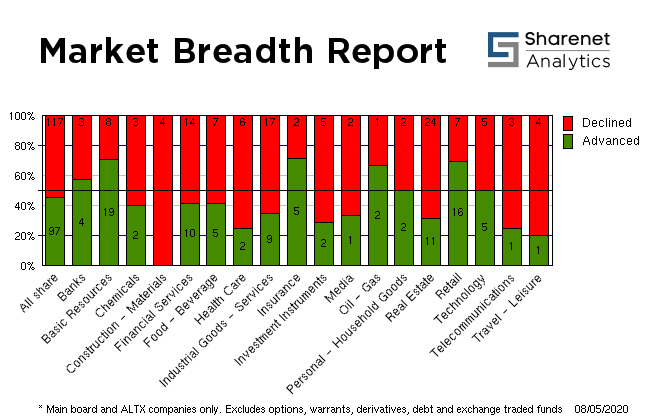 | | | Index Name | RP | Move | % Move | | Food Producers | 6,275.47 | 26.43 | 0.42% | | Personal Goods | 1,054.39 | 20.07 | 1.94% | | Consumer Services | 15,869.34 | 110.99 | 0.70% | | General Retailers | 3,366.33 | 80.98 | 2.46% | | Travel & Leisure | 1,306.56 | -30.48 | -2.28% | | Media | 556.66 | -6.97 | -1.24% | | Support Services | 1,088.89 | -13.54 | -1.23% | | Telecommunications | 3,408.13 | 12.46 | 0.37% | | Financials | 25,415.05 | 360.37 | 1.44% | | Banks | 5,108.52 | 70.93 | 1.41% | | Non-life Insurance | 73,744.40 | 1062.55 | 1.46% | | Life Insurance | 29,586.96 | 1016.63 | 3.56% | | General Financial | 2,385.61 | 23.67 | 1.00% | | Technology | 39,377.19 | 981.96 | 2.56% | | SHARIAH TOP40 | 2,844.09 | 62 | 2.22% | | FTSE/JSE SHARIAH ALL | 3,202.24 | 66 | 2.12% | | COAL MINING | 16,652.08 | 613 | 3.82% | | FTSE JSE Fledgling | 4,096.62 | -52 | -1.25% | | LARGE CAP | 53,098.29 | 1123 | 2.16% | | FTSE/JSE TOP 40 USD | 2,760.31 | -737 | -21.07% | | FTSE/JSE Alt X | 770.25 | -1 | -0.17% | | SA LISTED PROPERTY | 235.56 | .07 | 0.03% | | CAPPED PROPERTY | 171.79 | | -0.34% | | RESOURCE | 26,108.04 | 671 | 2.64% | | DIVIDEND PLUS | 181.44 | 2 | 1.21% | | FTSE/JSE RAFI 40 | 8,646.26 | 150 | 1.77% | | Capped Top 40 | 23,232.37 | 465 | 2.04% | | Capped All Share | 24,698.88 | 464 | 1.91% | | JSE TABACO | 8,803.70 | 140 | 1.62% | | JSE ALL PROPERTY | 5,871.81 | -21.41 | -0.36% | | ALL SHARE NET TRI | 51,003.58 | 984 | 1.97% |