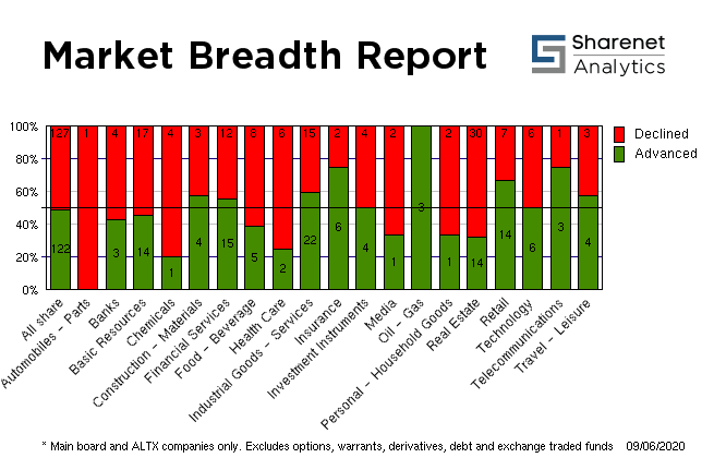 | | | Index Name | RP | Move | % Move | | Food Producers | 5,975.91 | 30.37 | 0.51% | | Personal Goods | 1,142.68 | -.70 | -0.06% | | Consumer Services | 17,067.98 | 25.29 | 0.15% | | General Retailers | 3,859.16 | 29.27 | 0.76% | | Travel & Leisure | 1,639.41 | -15.63 | -0.94% | | Media | 616.77 | 19.56 | 3.28% | | Support Services | 1,224.74 | 18.70 | 1.55% | | Telecommunications | 3,822.68 | 12.17 | 0.32% | | Financials | 28,751.77 | -101.76 | -0.35% | | Banks | 5,918.58 | -39.69 | -0.67% | | Non-life Insurance | 77,169.95 | 237.89 | 0.31% | | Life Insurance | 30,809.21 | 508.66 | 1.68% | | General Financial | 2,630.58 | -5.57 | -0.21% | | Technology | 38,317.84 | -155.93 | -0.41% | | SHARIAH TOP40 | 3,117.26 | -5 | -0.17% | | FTSE/JSE SHARIAH ALL | 3,506.22 | -6 | -0.17% | | COAL MINING | 20,547.17 | 149 | 0.73% | | FTSE JSE Fledgling | 4,466.76 | 5 | 0.10% | | LARGE CAP | 56,185.27 | -226 | -0.40% | | FTSE/JSE TOP 40 USD | 3,222.21 | -275 | -7.87% | | FTSE/JSE Alt X | 813.13 | -3 | -0.37% | | SA LISTED PROPERTY | 288.31 | -6.78 | -2.30% | | CAPPED PROPERTY | 215.29 | | -2.09% | | RESOURCE | 28,814.19 | -73 | -0.25% | | DIVIDEND PLUS | 210.27 | -1 | -0.45% | | FTSE/JSE RAFI 40 | 9,592.39 | -59 | -0.62% | | Capped Top 40 | 24,947.08 | -89 | -0.36% | | Capped All Share | 26,643.15 | -91 | -0.34% | | JSE TABACO | 8,152.52 | -356 | -4.19% | | JSE ALL PROPERTY | 7,321.21 | -150.10 | -2.01% | | ALL SHARE NET TRI | 54,483.48 | -201 | -0.37% |