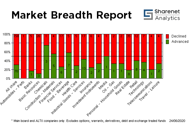 | | | Index Name | RP | Move | % Move | | Food Producers | 5,898.47 | -1.63 | -0.03% | | Personal Goods | 1,122.11 | -12.09 | -1.07% | | Consumer Services | 16,991.15 | -38.57 | -0.23% | | General Retailers | 3,678.50 | 9.77 | 0.27% | | Travel & Leisure | 1,653.62 | 37.69 | 2.33% | | Media | 695.72 | -1.37 | -0.20% | | Support Services | 1,164.97 | -55.14 | -4.52% | | Telecommunications | 3,619.11 | -142.20 | -3.78% | | Financials | 26,138.72 | -284.65 | -1.08% | | Banks | 5,218.03 | -42.85 | -0.81% | | Non-life Insurance | 74,968.19 | 959.47 | 1.30% | | Life Insurance | 28,891.07 | -512.30 | -1.74% | | General Financial | 2,425.23 | -15.26 | -0.63% | | Technology | 42,037.77 | -971.49 | -2.26% | | SHARIAH TOP40 | 3,099.63 | -66 | -2.08% | | FTSE/JSE SHARIAH ALL | 3,484.83 | -70 | -1.98% | | COAL MINING | 19,442.95 | -958 | -4.70% | | FTSE JSE Fledgling | 4,508.64 | 25 | 0.56% | | LARGE CAP | 56,606.90 | -1134 | -1.96% | | FTSE/JSE TOP 40 USD | 3,116.88 | -380 | -10.88% | | FTSE/JSE Alt X | 820.97 | 7 | 0.89% | | SA LISTED PROPERTY | 266.32 | -3.78 | -1.40% | | CAPPED PROPERTY | 195.92 | | -1.68% | | RESOURCE | 28,928.80 | -712 | -2.40% | | DIVIDEND PLUS | 202.74 | -4 | -1.73% | | FTSE/JSE RAFI 40 | 9,279.47 | -172 | -1.82% | | Capped Top 40 | 24,751.53 | -487 | -1.93% | | Capped All Share | 26,351.54 | -485 | -1.81% | | JSE TABACO | 8,449.36 | -282 | -3.23% | | JSE ALL PROPERTY | 6,704.92 | -113.93 | -1.67% | | ALL SHARE NET TRI | 54,447.73 | -1027 | -1.85% |
