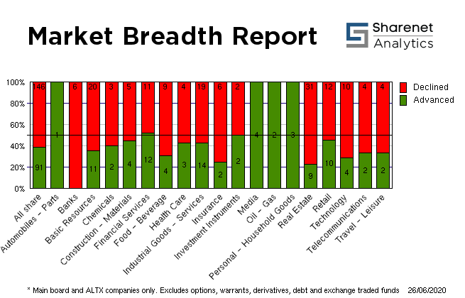 | | | Index Name | RP | Move | % Move | | Food Producers | 5,842.41 | 45.95 | 0.79% | | Personal Goods | 1,096.74 | 4.49 | 0.41% | | Consumer Services | 16,611.58 | -23.89 | -0.14% | | General Retailers | 3,539.06 | -67.63 | -1.88% | | Travel & Leisure | 1,574.56 | -15.93 | -1.00% | | Media | 692.59 | .58 | 0.08% | | Support Services | 1,170.99 | 10.40 | 0.90% | | Telecommunications | 3,694.67 | 45.71 | 1.25% | | Financials | 25,752.53 | -484.77 | -1.85% | | Banks | 5,093.90 | -181.28 | -3.44% | | Non-life Insurance | 71,233.39 | -1572.69 | -2.16% | | Life Insurance | 28,725.30 | -81.46 | -0.28% | | General Financial | 2,389.17 | -19.43 | -0.81% | | Technology | 41,165.65 | -151.10 | -0.37% | | SHARIAH TOP40 | 3,061.19 | -9 | -0.29% | | FTSE/JSE SHARIAH ALL | 3,439.26 | -9 | -0.26% | | COAL MINING | 19,394.17 | -501 | -2.52% | | FTSE JSE Fledgling | 4,511.24 | 60 | 1.36% | | LARGE CAP | 55,787.79 | -307 | -0.55% | | FTSE/JSE TOP 40 USD | 3,067.77 | -430 | -12.28% | | FTSE/JSE Alt X | 827.01 | 6 | 0.70% | | SA LISTED PROPERTY | 267.11 | -3.09 | -1.14% | | CAPPED PROPERTY | 196.22 | | -1.16% | | RESOURCE | 28,619.50 | -169 | -0.59% | | DIVIDEND PLUS | 198.97 | -2 | -0.94% | | FTSE/JSE RAFI 40 | 9,156.92 | -43 | -0.47% | | Capped Top 40 | 24,415.14 | -139 | -0.57% | | Capped All Share | 25,975.27 | -133 | -0.51% | | JSE TABACO | 8,505.20 | 95 | 1.13% | | JSE ALL PROPERTY | 6,704.52 | -86.56 | -1.27% | | ALL SHARE NET TRI | 53,648.05 | -266 | -0.49% |