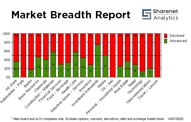 | | | Index Name | RP | Move | % Move | | Food Producers | 5,923.25 | -66.81 | -1.12% | | Personal Goods | 1,118.22 | .30 | 0.03% | | Consumer Services | 16,315.53 | -88.53 | -0.54% | | General Retailers | 3,413.80 | -29.16 | -0.85% | | Travel & Leisure | 1,339.33 | -58.08 | -4.16% | | Media | 704.13 | -8.48 | -1.19% | | Support Services | 1,171.73 | -29.23 | -2.43% | | Telecommunications | 3,864.67 | -30.16 | -0.77% | | Financials | 27,028.01 | -396.99 | -1.45% | | Banks | 5,444.67 | -145.56 | -2.60% | | Non-life Insurance | 70,226.34 | -1139.21 | -1.60% | | Life Insurance | 30,755.71 | -205.73 | -0.66% | | General Financial | 2,385.79 | -4.25 | -0.18% | | Technology | 41,949.81 | -1353.65 | -3.13% | | SHARIAH TOP40 | 3,200.95 | -7 | -0.23% | | FTSE/JSE SHARIAH ALL | 3,606.04 | -11 | -0.31% | | COAL MINING | 19,856.85 | -4 | -0.02% | | FTSE JSE Fledgling | 4,410.84 | -5 | -0.12% | | LARGE CAP | 57,845.45 | -727 | -1.24% | | FTSE/JSE TOP 40 USD | 3,277.51 | -220 | -6.28% | | FTSE/JSE Alt X | 852.98 | 2 | 0.19% | | SA LISTED PROPERTY | 279.92 | -2.35 | -0.83% | | CAPPED PROPERTY | 205.26 | | -0.78% | | RESOURCE | 30,526.95 | -68 | -0.22% | | DIVIDEND PLUS | 203.47 | -2 | -0.97% | | FTSE/JSE RAFI 40 | 9,472.61 | -100 | -1.04% | | Capped Top 40 | 25,393.15 | -244 | -0.95% | | Capped All Share | 26,955.29 | -261 | -0.96% | | JSE TABACO | 7,792.17 | -24 | -0.31% | | JSE ALL PROPERTY | 6,983.02 | -59.75 | -0.85% | | ALL SHARE NET TRI | 55,531.05 | -668 | -1.19% |