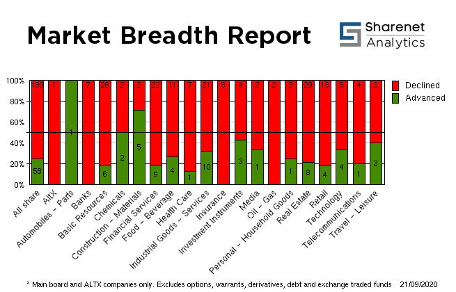 | | | Index Name | RP | Move | % Move | | Food Producers | 5,762.37 | -171.95 | -2.90% | | Personal Goods | 1,123.51 | -7.09 | -0.63% | | Consumer Services | 16,799.00 | -601.02 | -3.45% | | General Retailers | 3,630.00 | -143.29 | -3.80% | | Travel & Leisure | 1,384.83 | -37.50 | -2.64% | | Media | 574.00 | -6.26 | -1.08% | | Support Services | 1,329.24 | -16.52 | -1.23% | | Telecommunications | 3,605.85 | -154.02 | -4.10% | | Financials | 24,315.08 | -757.58 | -3.02% | | Banks | 5,070.98 | -162.83 | -3.11% | | Non-life Insurance | 63,462.48 | -708.36 | -1.10% | | Life Insurance | 26,223.84 | -994.02 | -3.65% | | General Financial | 2,307.52 | -57.69 | -2.44% | | Technology | 37,779.05 | -778.17 | -2.02% | | SHARIAH TOP40 | 3,187.82 | -78 | -2.38% | | FTSE/JSE SHARIAH ALL | 3,591.77 | -87 | -2.36% | | COAL MINING | 18,918.18 | -439 | -2.27% | | FTSE JSE Fledgling | 4,339.62 | -12 | -0.27% | | LARGE CAP | 55,531.46 | -1336 | -2.35% | | FTSE/JSE TOP 40 USD | 3,131.52 | -366 | -10.46% | | FTSE/JSE Alt X | 834.37 | -26 | -3.05% | | SA LISTED PROPERTY | 222.54 | -7.79 | -3.38% | | CAPPED PROPERTY | 163.45 | | -2.71% | | RESOURCE | 30,878.70 | -856 | -2.70% | | DIVIDEND PLUS | 199.60 | -7 | -3.24% | | FTSE/JSE RAFI 40 | 9,036.98 | -263 | -2.82% | | Capped Top 40 | 24,519.44 | -645 | -2.56% | | Capped All Share | 26,041.05 | -670 | -2.51% | | JSE TABACO | 7,232.49 | 57 | 0.79% | | JSE ALL PROPERTY | 5,571.68 | -158.60 | -2.77% | | ALL SHARE NET TRI | 53,319.08 | -1355 | -2.48% |