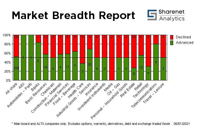 | | | Index Name | RP | Move | % Move | | Food Producers | 6,158.40 | -40.77 | -0.66% | | Personal Goods | 1,366.46 | -13.25 | -0.96% | | Consumer Services | 18,983.86 | 88.94 | 0.47% | | General Retailers | 4,449.91 | -26.10 | -0.58% | | Travel & Leisure | 1,361.64 | .44 | 0.03% | | Media | 867.06 | -2.35 | -0.27% | | Support Services | 1,742.86 | -3.21 | -0.18% | | Telecommunications | 4,062.07 | 96.63 | 2.44% | | Financials | 29,385.72 | 94.57 | 0.32% | | Banks | 6,608.50 | 55.71 | 0.85% | | Non-life Insurance | 68,053.66 | -1477.53 | -2.12% | | Life Insurance | 29,814.26 | -196.16 | -0.65% | | General Financial | 2,496.23 | 27.63 | 1.12% | | Technology | 41,607.85 | -185.32 | -0.44% | | SHARIAH TOP40 | 3,751.94 | 104 | 2.85% | | FTSE/JSE SHARIAH ALL | 4,234.39 | 109 | 2.65% | | COAL MINING | 21,790.35 | 288 | 1.34% | | FTSE JSE Fledgling | 5,560.31 | 41 | 0.74% | | LARGE CAP | 64,343.69 | 1164 | 1.84% | | FTSE/JSE TOP 40 USD | 4,050.34 | 553 | 15.81% | | FTSE/JSE Alt X | 1,011.67 | 5 | 0.51% | | SA LISTED PROPERTY | 261.51 | -3.05 | -1.15% | | CAPPED PROPERTY | 193.13 | | -1.02% | | RESOURCE | 36,551.45 | 1361 | 3.87% | | DIVIDEND PLUS | 242.49 | 4 | 1.61% | | FTSE/JSE RAFI 40 | 10,623.17 | 265 | 2.56% | | Capped Top 40 | 28,412.15 | 459 | 1.64% | | Capped All Share | 30,349.82 | 486 | 1.63% | | JSE TABACO | 7,390.17 | 119 | 1.64% | | JSE ALL PROPERTY | 6,574.97 | -65.21 | -0.98% | | ALL SHARE NET TRI | 61,857.42 | 936 | 1.54% |