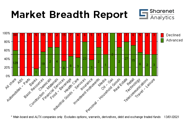 | | | Index Name | RP | Move | % Move | | Food Producers | 6,164.33 | -117.12 | -1.86% | | Personal Goods | 1,431.20 | -46.67 | -3.16% | | Consumer Services | 19,563.52 | 140.40 | 0.72% | | General Retailers | 4,554.36 | 50.64 | 1.12% | | Travel & Leisure | 1,443.98 | 34.55 | 2.45% | | Media | 905.46 | -.79 | -0.09% | | Support Services | 1,816.96 | 57.16 | 3.25% | | Telecommunications | 4,214.72 | 6.70 | 0.16% | | Financials | 30,219.03 | -202.74 | -0.67% | | Banks | 6,787.14 | -114.04 | -1.65% | | Non-life Insurance | 71,048.37 | 330.40 | 0.47% | | Life Insurance | 30,459.92 | -358.10 | -1.16% | | General Financial | 2,577.69 | 10.58 | 0.41% | | Technology | 42,733.10 | 38.03 | 0.09% | | SHARIAH TOP40 | 3,843.93 | -13 | -0.35% | | FTSE/JSE SHARIAH ALL | 4,338.82 | -10 | -0.23% | | COAL MINING | 22,780.75 | 401 | 1.79% | | FTSE JSE Fledgling | 5,976.43 | 30 | 0.51% | | LARGE CAP | 65,879.10 | -269 | -0.41% | | FTSE/JSE TOP 40 USD | 4,113.44 | 616 | 17.62% | | FTSE/JSE Alt X | 991.37 | -22 | -2.13% | | SA LISTED PROPERTY | 271.17 | 5.58 | 2.10% | | CAPPED PROPERTY | 200.25 | | 2.14% | | RESOURCE | 37,227.60 | 213 | 0.58% | | DIVIDEND PLUS | 249.72 | 2 | 0.71% | | FTSE/JSE RAFI 40 | 11,014.75 | 5 | 0.05% | | Capped Top 40 | 29,128.82 | -59 | -0.20% | | Capped All Share | 31,138.28 | -26 | -0.08% | | JSE TABACO | 7,322.96 | 59 | 0.81% | | JSE ALL PROPERTY | 6,819.09 | 146.90 | 2.20% | | ALL SHARE NET TRI | 63,474.53 | -61 | -0.10% |
