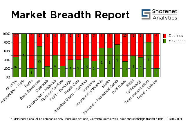 | | | Index Name | RP | Move | % Move | | Food Producers | 6,136.15 | -128.70 | -2.05% | | Personal Goods | 1,430.70 | -12.04 | -0.83% | | Consumer Services | 19,831.58 | 44.48 | 0.22% | | General Retailers | 4,769.92 | 19.18 | 0.40% | | Travel & Leisure | 1,469.86 | -27.37 | -1.83% | | Media | 853.18 | 2.74 | 0.32% | | Support Services | 2,169.40 | -86.33 | -3.83% | | Telecommunications | 4,113.13 | 24.21 | 0.59% | | Financials | 30,048.78 | -198.26 | -0.66% | | Banks | 6,746.92 | -63.05 | -0.93% | | Non-life Insurance | 74,537.35 | -1300.44 | -1.71% | | Life Insurance | 30,552.62 | -177.57 | -0.58% | | General Financial | 2,576.84 | 5.94 | 0.23% | | Technology | 46,648.92 | -13.28 | -0.03% | | SHARIAH TOP40 | 3,791.42 | 15 | 0.39% | | FTSE/JSE SHARIAH ALL | 4,293.68 | 14 | 0.34% | | COAL MINING | 24,530.96 | 1471 | 6.38% | | FTSE JSE Fledgling | 5,873.41 | 34 | 0.58% | | LARGE CAP | 66,594.97 | 81 | 0.12% | | FTSE/JSE TOP 40 USD | 4,277.58 | 780 | 22.31% | | FTSE/JSE Alt X | 987.40 | -6 | -0.56% | | SA LISTED PROPERTY | 265.85 | -1.49 | -0.56% | | CAPPED PROPERTY | 195.45 | | -1.01% | | RESOURCE | 36,677.29 | 290 | 0.80% | | DIVIDEND PLUS | 251.86 | 2 | 0.86% | | FTSE/JSE RAFI 40 | 10,939.35 | -6 | -0.06% | | Capped Top 40 | 29,169.55 | 83 | 0.29% | | Capped All Share | 31,249.07 | 42 | 0.13% | | JSE TABACO | 7,179.84 | 64 | 0.89% | | JSE ALL PROPERTY | 6,660.09 | -57.47 | -0.86% | | ALL SHARE NET TRI | 64,174.88 | 66 | 0.10% |
