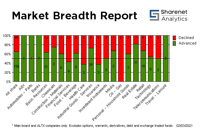 | | | Index Name | RP | Move | % Move | | Food Producers | 6,121.72 | -8.74 | -0.14% | | Personal Goods | 1,476.56 | 10.64 | 0.73% | | Consumer Services | 20,879.97 | 240.96 | 1.17% | | General Retailers | 5,396.54 | 70.58 | 1.33% | | Travel & Leisure | 1,683.70 | 40.48 | 2.46% | | Media | 845.22 | .32 | 0.04% | | Support Services | 2,219.62 | 48.37 | 2.23% | | Telecommunications | 4,543.34 | 5.12 | 0.11% | | Financials | 31,758.47 | 268.60 | 0.85% | | Banks | 7,080.72 | 75.35 | 1.08% | | Non-life Insurance | 66,972.60 | 980.61 | 1.49% | | Life Insurance | 32,914.21 | -44.12 | -0.13% | | General Financial | 2,612.74 | 8.23 | 0.32% | | Technology | 49,436.81 | 824.96 | 1.70% | | SHARIAH TOP40 | 4,107.67 | 72 | 1.78% | | FTSE/JSE SHARIAH ALL | 4,637.62 | 74 | 1.61% | | COAL MINING | 25,156.24 | -374 | -1.46% | | FTSE JSE Fledgling | 6,213.89 | 58 | 0.95% | | LARGE CAP | 71,324.25 | 1098 | 1.56% | | FTSE/JSE TOP 40 USD | 4,518.66 | 1021 | 29.20% | | FTSE/JSE Alt X | 1,058.89 | -11 | -0.99% | | SA LISTED PROPERTY | 292.87 | 5.48 | 1.91% | | CAPPED PROPERTY | 217.95 | | 1.66% | | RESOURCE | 40,472.27 | 820 | 2.07% | | DIVIDEND PLUS | 264.51 | 2 | 0.73% | | FTSE/JSE RAFI 40 | 11,692.59 | 130 | 1.12% | | Capped Top 40 | 31,154.32 | 474 | 1.54% | | Capped All Share | 33,330.48 | 453 | 1.38% | | JSE TABACO | 6,809.65 | 62 | 0.91% | | JSE ALL PROPERTY | 7,417.86 | 120.17 | 1.65% | | ALL SHARE NET TRI | 68,510.75 | 974 | 1.44% |