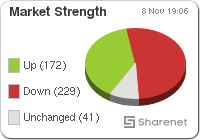 | | | Index Name | RP | Move | % Move | | FTSE/JSE Life Insurance | 34,352.27 | -340.75 | -0.98% | | FTSE/JSE Technology | 33,037.24 | -441.54 | -1.32% | | SHARIAH TOP40 | 3,741.29 | 22 | 0.59% | | FTSE/JSE SHARIAH ALL | 4,346.10 | 21 | 0.50% | | FTSE JSE Fledgling | 8,276.06 | -77 | -0.93% | | LARGE CAP | 67,996.14 | 304 | 0.45% | | FTSE/JSE TOP 40 USD | 4,409.06 | 912 | 26.07% | | FTSE/JSE Alt X | 1,432.79 | 33 | 2.35% | | FTSE/JSE AFRICA ALTX 15 | 927.14 | 12 | 1.27% | | SA LISTED PROPERTY | 330.33 | 6.14 | 1.89% | | CAPPED PROPERTY | 246.83 | | 2.21% | | RESOURCE | 35,685.86 | 360 | 1.02% | | DIVIDEND PLUS | 286.33 | 1 | 0.21% | | FTSE/JSE RAFI 40 | 12,810.47 | 62 | 0.49% | | FTSE/JSE RAFI ALLSHARE | 11,940.21 | 57 | 0.48% | | Capped Top 40 | 31,611.66 | 68 | 0.22% | | Capped All Share | 34,163.66 | 102 | 0.30% | | CAPPED INDUSTRIAL 25 | 86,681.88 | | 15.81% | | All Share Style Value | 391.76 | 0 | 0.00% | | All Share Style Growth | 866.65 | 0 | 0.00% | | JSE ALL PROPERTY | 8,464.59 | 176.61 | 2.13% | | ALL SHARE NET TRI | 68,049.34 | 224 | 0.33% | | JSE SWIX ALSI NET TRI | 13,500.73 | -11 | -0.08% | | FTSE/JSE Leisure Goods | 1,193.48 | 7 | 0.55% | | FTSE/JSE Retailers | 6,526.27 | -53 | -0.81% | | FTSE/JSE Tobacco | 6,587.57 | -62 | -0.94% |
