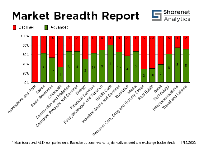 | Index Name | RP | Move | % Move | | Top 40 | 67,796.69 | 129.47 | 0.19% | | Industrial | 110,736.37 | 957.60 | 0.87% | | Mid Cap | 75,332.01 | 444.91 | 0.59% | | Small Cap | 69,552.91 | 70.23 | 0.10% | | Resource 20 | 52,972.61 | -1001.56 | -1.86% | | Industrial 25 | 104,174.17 | 966.52 | 0.94% | | Financial 15 | 16,778.39 | 96.16 | 0.58% | | All Share | 73,892.30 | 101.45 | 0.14% | | FTSE/JSE Energy | 29,242.59 | 297.38 | 1.03% | | FTSE/JSE Basic Materials | 39,483.95 | -632.70 | -1.58% | | FTSE/JSE Chemicals | 10,167.76 | -95.46 | -0.93% | | FTSE/JSE Industrials | 37,566.86 | 397.43 | 1.07% | | FTSE/JSE Consumer Staples | 80,407.08 | 99.42 | 0.12% | | FTSE/JSE Health Care | 5,205.94 | 31.73 | 0.61% | | FTSE/JSE Beverages | 234.53 | 2.32 | 1.00% | | FTSE/JSE Food Producers | 6,177.60 | 27.79 | 0.45% | | FTSE/JSE Personal Goods | 2,588.26 | 56.06 | 2.21% | | FTSE/JSE Travel & Leisure | 3,208.92 | 18.41 | 0.58% | | FTSE/JSE Media | 825.99 | .00 | 0.00% | | FTSE/JSE Real Estate | 1,075.95 | -3.14 | -0.29% | | FTSE/JSE SA Financials | 40,919.58 | 215.74 | 0.53% | | FTSE/JSE Financials | 42,453.19 | 275.84 | 0.65% | | FTSE/JSE Banks | 10,264.68 | 54.16 | 0.53% | | FTSE/JSE Life Insurance | 34,595.42 | 395.79 | 1.16% | | FTSE/JSE Technology | 41,777.62 | 586.46 | 1.42% |