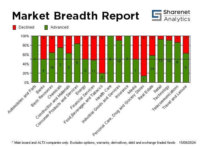 | Index Name | RP | Move | % Move | | Top 40 | 75,170.13 | 774.90 | 1.04% | | Industrial | 118,754.76 | 813.74 | 0.69% | | Mid Cap | 86,250.34 | 722.19 | 0.84% | | Small Cap | 81,199.29 | 631.29 | 0.78% | | Resource 20 | 58,819.92 | 612.06 | 1.05% | | Industrial 25 | 111,114.17 | 783.00 | 0.71% | | Financial 15 | 20,053.02 | 313.42 | 1.59% | | All Share | 82,226.43 | 824.11 | 1.01% | | FTSE/JSE Energy | 25,674.36 | -799.33 | -3.02% | | FTSE/JSE Basic Materials | 42,771.02 | 459.98 | 1.09% | | FTSE/JSE Chemicals | 8,295.62 | 257.02 | 3.20% | | FTSE/JSE Industrials | 40,849.35 | 444.68 | 1.10% | | FTSE/JSE Consumer Staples | 88,668.57 | -647.37 | -0.72% | | FTSE/JSE Health Care | 5,983.99 | 51.77 | 0.87% | | FTSE/JSE Beverages | 211.38 | -1.90 | -0.89% | | FTSE/JSE Food Producers | 7,241.25 | 18.81 | 0.26% | | FTSE/JSE Personal Goods | 2,792.33 | 26.22 | 0.95% | | FTSE/JSE Travel & Leisure | 3,243.49 | .93 | 0.03% | | FTSE/JSE Media | 825.99 | .00 | 0.00% | | FTSE/JSE Real Estate | 1,283.54 | 3.78 | 0.30% | | FTSE/JSE SA Financials | 48,868.07 | 715.36 | 1.49% | | FTSE/JSE Financials | 50,720.63 | 833.65 | 1.67% | | FTSE/JSE Banks | 12,704.15 | 250.45 | 2.01% | | FTSE/JSE Life Insurance | 39,820.71 | 514.15 | 1.31% | | FTSE/JSE Technology | 44,414.99 | 471.06 | 1.07% |