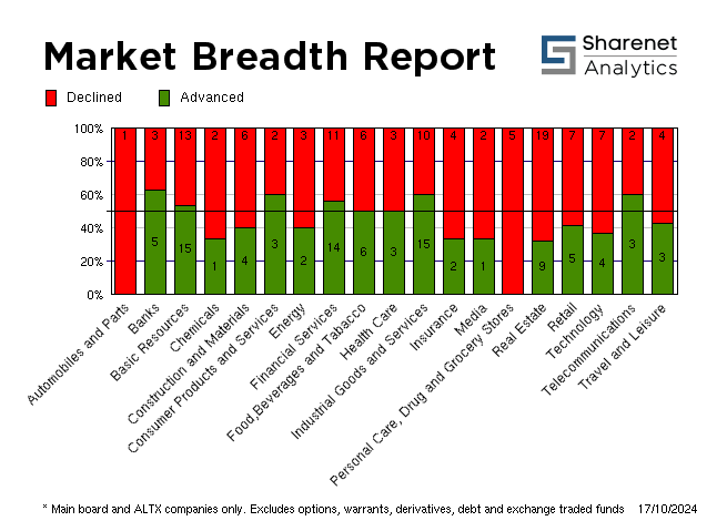 | Index Name | RP | Move | % Move | | Top 40 | 78,567.58 | 263.91 | 0.34% | | Industrial | 125,132.82 | -673.87 | -0.54% | | Mid Cap | 91,667.72 | 365.34 | 0.40% | | Small Cap | 88,923.65 | -262.56 | -0.29% | | Resource 20 | 60,750.86 | 2053.31 | 3.50% | | Industrial 25 | 116,842.48 | -703.92 | -0.60% | | Financial 15 | 21,334.08 | -83.52 | -0.39% | | All Share | 86,582.35 | 189.34 | 0.22% | | FTSE/JSE Energy | 25,026.23 | 215.27 | 0.87% | | FTSE/JSE Basic Materials | 44,189.53 | 1331.46 | 3.11% | | FTSE/JSE Chemicals | 7,229.37 | -9.83 | -0.14% | | FTSE/JSE Industrials | 41,037.04 | -220.89 | -0.54% | | FTSE/JSE Consumer Staples | 90,082.01 | -546.22 | -0.60% | | FTSE/JSE Health Care | 5,686.98 | 16.36 | 0.29% | | FTSE/JSE Beverages | 226.20 | 1.06 | 0.47% | | FTSE/JSE Food Producers | 7,729.63 | -28.59 | -0.37% | | FTSE/JSE Personal Goods | 2,641.33 | 11.78 | 0.45% | | FTSE/JSE Travel & Leisure | 3,761.16 | 4.17 | 0.11% | | FTSE/JSE Media | 825.99 | .00 | 0.00% | | FTSE/JSE Real Estate | 1,389.64 | -25.48 | -1.80% | | FTSE/JSE SA Financials | 52,076.23 | -242.26 | -0.46% | | FTSE/JSE Financials | 53,918.84 | -134.04 | -0.25% | | FTSE/JSE Banks | 13,295.73 | -66.57 | -0.50% | | FTSE/JSE Life Insurance | 43,760.66 | 415.12 | 0.96% | | FTSE/JSE Technology | 49,687.74 | -589.95 | -1.17% |