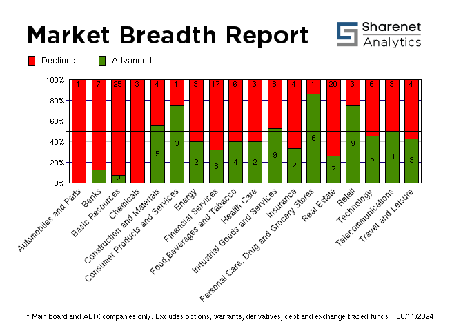 | Index Name | RP | Move | % Move | | Top 40 | 76,969.90 | -910.94 | -1.17% | | Industrial | 123,577.61 | -591.53 | -0.48% | | Mid Cap | 91,438.33 | -533.85 | -0.58% | | Small Cap | 87,937.59 | -215.77 | -0.24% | | Resource 20 | 57,811.24 | -1683.38 | -2.83% | | Industrial 25 | 115,311.68 | -599.35 | -0.52% | | Financial 15 | 21,130.09 | -135.01 | -0.63% | | Financial 30 | 119,186.12 | -834.20 | -0.70% | | All Share | 85,124.52 | -873.70 | -1.02% | | FTSE/JSE Energy | 25,581.82 | 73.54 | 0.29% | | FTSE/JSE Basic Materials | 42,493.27 | -1314.74 | -3.00% | | FTSE/JSE Chemicals | 6,565.76 | -321.07 | -4.66% | | FTSE/JSE Industrials | 39,698.67 | -245.66 | -0.62% | | FTSE/JSE Consumer Staples | 90,538.98 | 279.11 | 0.31% | | FTSE/JSE Health Care | 5,436.79 | -22.47 | -0.41% | | FTSE/JSE Beverages | 196.17 | -.49 | -0.25% | | FTSE/JSE Food Producers | 7,940.98 | 12.52 | 0.16% | | FTSE/JSE Personal Goods | 2,463.67 | -129.46 | -4.99% | | FTSE/JSE Travel & Leisure | 3,703.73 | -1.22 | -0.03% | | FTSE/JSE Media | 825.99 | .00 | 0.00% | | FTSE/JSE Real Estate | 1,343.53 | -6.45 | -0.48% | | FTSE/JSE SA Financials | 51,505.29 | -300.17 | -0.58% | | FTSE/JSE Financials | 53,520.30 | -320.51 | -0.60% | | FTSE/JSE Banks | 13,154.83 | -93.47 | -0.71% | | FTSE/JSE Life Insurance | 44,141.40 | 11.94 | 0.03% |