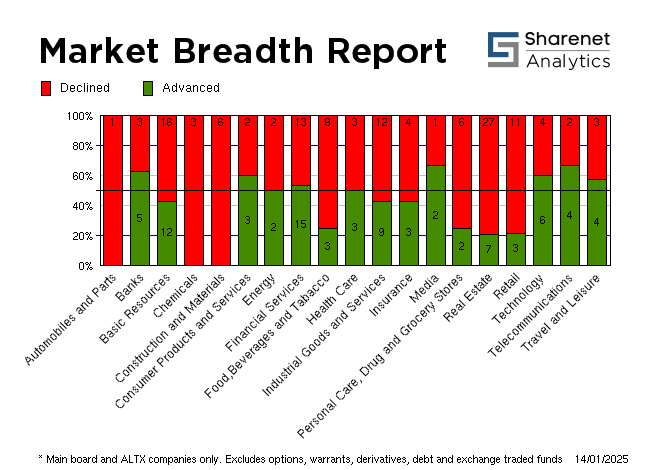 | Index Name | RP | Move | % Move | | Top 40 | 73,714.83 | 148.32 | 0.20% | | Industrial | 120,399.16 | 721.04 | 0.60% | | Mid Cap | 87,803.85 | -384.71 | -0.44% | | Small Cap | 89,022.25 | -620.31 | -0.69% | | Resource 20 | 57,143.29 | -372.26 | -0.65% | | Industrial 25 | 111,662.57 | 765.88 | 0.69% | | Financial 15 | 19,880.85 | -17.94 | -0.09% | | Financial 30 | 113,706.65 | 462.92 | 0.41% | | All Share | 82,123.89 | 78.09 | 0.10% | | FTSE/JSE Energy | 23,919.63 | 394.38 | 1.68% | | FTSE/JSE Basic Materials | 41,608.63 | -214.52 | -0.51% | | FTSE/JSE Chemicals | 6,221.89 | -129.56 | -2.04% | | FTSE/JSE Industrials | 37,765.90 | -304.33 | -0.80% | | FTSE/JSE Consumer Staples | 89,402.76 | -863.56 | -0.96% | | FTSE/JSE Health Care | 5,192.07 | -49.52 | -0.94% | | FTSE/JSE Beverages | 171.87 | -.30 | -0.17% | | FTSE/JSE Food Producers | 8,331.96 | .75 | 0.01% | | FTSE/JSE Personal Goods | 2,963.99 | 20.66 | 0.70% | | FTSE/JSE Travel & Leisure | 3,441.89 | 6.11 | 0.18% | | FTSE/JSE Media | 825.99 | .00 | 0.00% | | FTSE/JSE Real Estate | 1,305.58 | -13.11 | -0.99% | | FTSE/JSE SA Financials | 48,716.99 | -104.10 | -0.21% | | FTSE/JSE Financials | 50,407.09 | -42.05 | -0.08% | | FTSE/JSE Banks | 12,245.66 | -18.78 | -0.15% | | FTSE/JSE Life Insurance | 42,788.25 | -345.55 | -0.80% |
