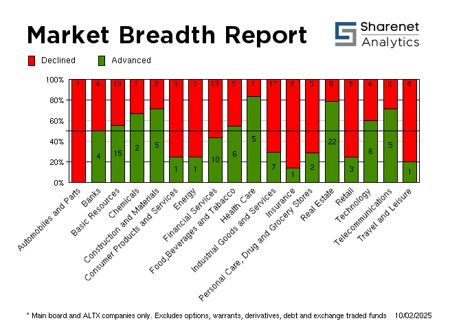 | Index Name | RP | Move | % Move | | Top 40 | 79,921.64 | 286.12 | 0.36% | | Industrial | 130,342.47 | 146.69 | 0.11% | | Mid Cap | 90,417.39 | 352.45 | 0.39% | | Small Cap | 89,504.20 | 171.01 | 0.19% | | Resource 20 | 64,151.72 | 1161.60 | 1.84% | | Industrial 25 | 121,833.11 | 162.14 | 0.13% | | Financial 15 | 20,472.78 | -40.51 | -0.20% | | Financial 30 | 121,948.58 | -22.73 | -0.02% | | All Share | 87,765.36 | 290.87 | 0.33% | | FTSE/JSE Energy | 26,119.44 | -22.52 | -0.09% | | FTSE/JSE Basic Materials | 46,169.59 | 700.43 | 1.54% | | FTSE/JSE Chemicals | 5,480.07 | 67.11 | 1.24% | | FTSE/JSE Industrials | 38,951.48 | -157.89 | -0.40% | | FTSE/JSE Consumer Staples | 93,197.36 | -132.00 | -0.14% | | FTSE/JSE Health Care | 5,118.92 | 11.53 | 0.23% | | FTSE/JSE Beverages | 180.20 | -1.89 | -1.04% | | FTSE/JSE Food Producers | 7,975.77 | -60.51 | -0.75% | | FTSE/JSE Personal Goods | 3,602.03 | -29.73 | -0.82% | | FTSE/JSE Travel & Leisure | 3,343.94 | -53.49 | -1.57% | | FTSE/JSE Media | 825.99 | .00 | 0.00% | | FTSE/JSE Real Estate | 1,338.17 | 15.92 | 1.20% | | FTSE/JSE SA Financials | 50,073.42 | -51.46 | -0.10% | | FTSE/JSE Financials | 51,834.46 | -163.29 | -0.31% | | FTSE/JSE Banks | 12,629.59 | -55.77 | -0.44% | | FTSE/JSE Life Insurance | 43,326.59 | 143.53 | 0.33% |