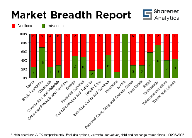 | | | Index Name | RP | Move | % Move | | FTSE/JSE Technology | 59,983.99 | 2941.23 | 5.16% | | SHARIAH TOP40 | 3,868.49 | 8 | 0.20% | | FTSE/JSE SHARIAH ALL | 4,614.83 | 17 | 0.38% | | FTSE JSE Fledgling | 9,821.85 | 11 | 0.12% | | LARGE CAP | 91,477.84 | 743 | 0.82% | | FTSE/JSE TOP 40 USD | 4,792.36 | 1295 | 37.03% | | FTSE/JSE Alt X | 526.23 | 1 | 0.23% | | FTSE/JSE AFRICA ALTX 15 | 195.32 | 2 | 0.87% | | SA LISTED PROPERTY | 374.50 | -4.52 | -1.19% | | CAPPED PROPERTY | 270.94 | | -1.02% | | RESOURCE | 35,983.21 | 526 | 1.48% | | DIVIDEND PLUS | 250.26 | 1 | 0.21% | | FTSE/JSE RAFI 40 | 16,069.01 | 162 | 1.02% | | FTSE/JSE RAFI ALLSHARE | 14,845.61 | 134 | 0.91% | | Capped Top 40 | 40,499.19 | 136 | 0.34% | | Capped All Share | 43,915.36 | 200 | 0.46% | | CAPPED INDUSTRIAL 25 | 121,785.27 | | 62.71% | | All Share Style Value | 462.17 | 0 | 0.00% | | All Share Style Growth | 1,252.02 | 0 | 0.00% | | JSE ALL PROPERTY | 9,328.74 | -95.74 | -1.02% | | ALL SHARE NET TRI | 88,260.08 | 543 | 0.62% | | JSE SWIX ALSI NET TRI | 16,663.10 | 102 | 0.62% | | FTSE/JSE Leisure Goods | 1,350.00 | 0 | 0.00% | | FTSE/JSE Retailers | 6,950.68 | -43 | -0.61% | | FTSE/JSE Tobacco | 9,303.07 | 4 | 0.04% |