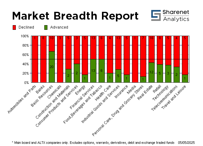 | Index Name | RP | Move | % Move | | Top 40 | 84,543.85 | -193.34 | -0.23% | | Industrial | 138,089.70 | -1639.56 | -1.17% | | Mid Cap | 90,924.91 | -840.05 | -0.92% | | Small Cap | 90,020.49 | -269.66 | -0.30% | | Resource 20 | 70,477.70 | 1935.30 | 2.82% | | Industrial 25 | 129,958.65 | -1620.20 | -1.23% | | Financial 15 | 20,719.46 | -190.80 | -0.91% | | Financial 30 | 127,935.00 | -1423.52 | -1.10% | | All Share | 92,063.06 | -269.53 | -0.29% | | FTSE/JSE Energy | 20,994.16 | -594.93 | -2.76% | | FTSE/JSE Basic Materials | 50,132.11 | 1230.52 | 2.52% | | FTSE/JSE Chemicals | 4,889.07 | -72.34 | -1.46% | | FTSE/JSE Industrials | 37,392.94 | -312.06 | -0.83% | | FTSE/JSE Consumer Staples | 96,747.23 | -760.59 | -0.78% | | FTSE/JSE Health Care | 4,217.17 | -102.40 | -2.37% | | FTSE/JSE Beverages | 232.09 | -4.80 | -2.03% | | FTSE/JSE Food Producers | 8,163.91 | 12.65 | 0.16% | | FTSE/JSE Personal Goods | 3,311.78 | -14.87 | -0.45% | | FTSE/JSE Travel & Leisure | 3,285.16 | -57.63 | -1.72% | | FTSE/JSE Media | 825.99 | .00 | 0.00% | | FTSE/JSE Real Estate | 1,401.57 | -10.33 | -0.73% | | FTSE/JSE SA Financials | 51,037.14 | -431.41 | -0.84% | | FTSE/JSE Financials | 52,585.85 | -454.36 | -0.86% | | FTSE/JSE Banks | 12,521.28 | -135.04 | -1.07% | | FTSE/JSE Life Insurance | 45,321.27 | -206.47 | -0.45% |